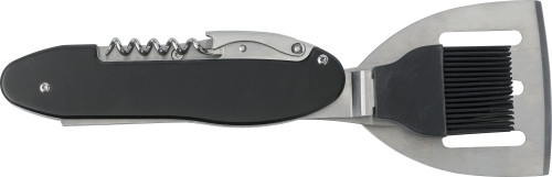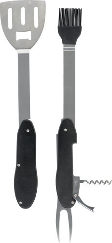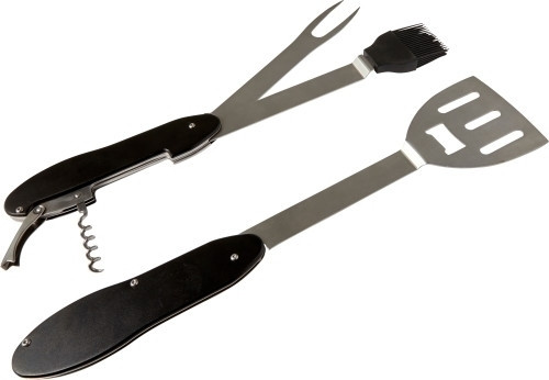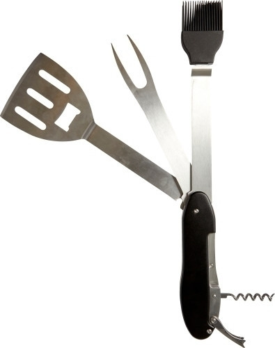 Grillset 'Joko' aus Edelstahl, bestehend aus Silikonpinsel, Gabel, Wender, Flaschenöffner und Korkenzieher, mit Verriegelung