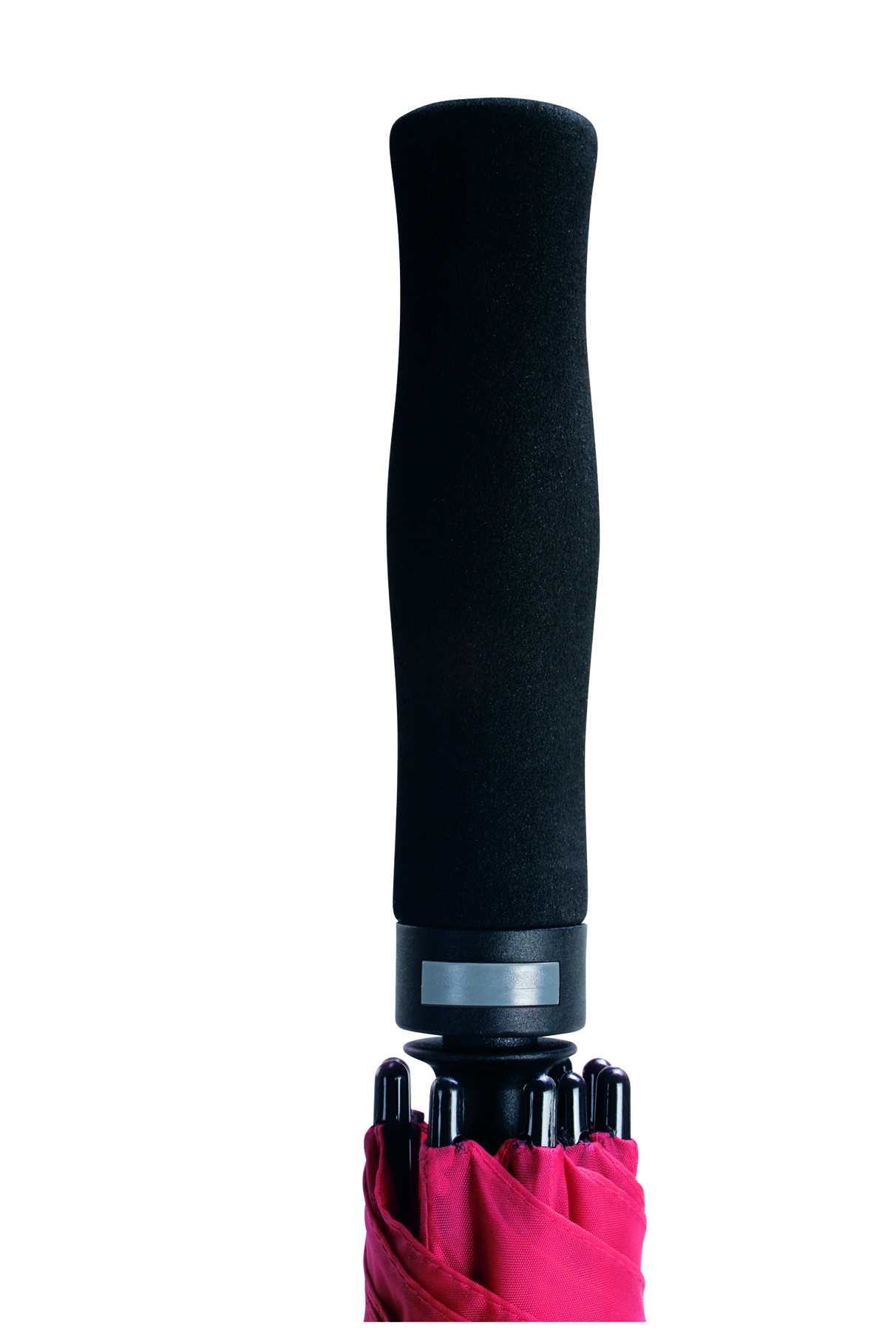 TÜV-zertifiziert | Automatisch öffnend | 75 cm / 8-teilig | 14 mm Fiberglasstock mit Fiberglasschienen | Schwarzer Softgriff mit Auslösetaste | Schwarze Kunststoffspitzen und schwarzes Top | 100% Nylon Bezug | Windproof-System