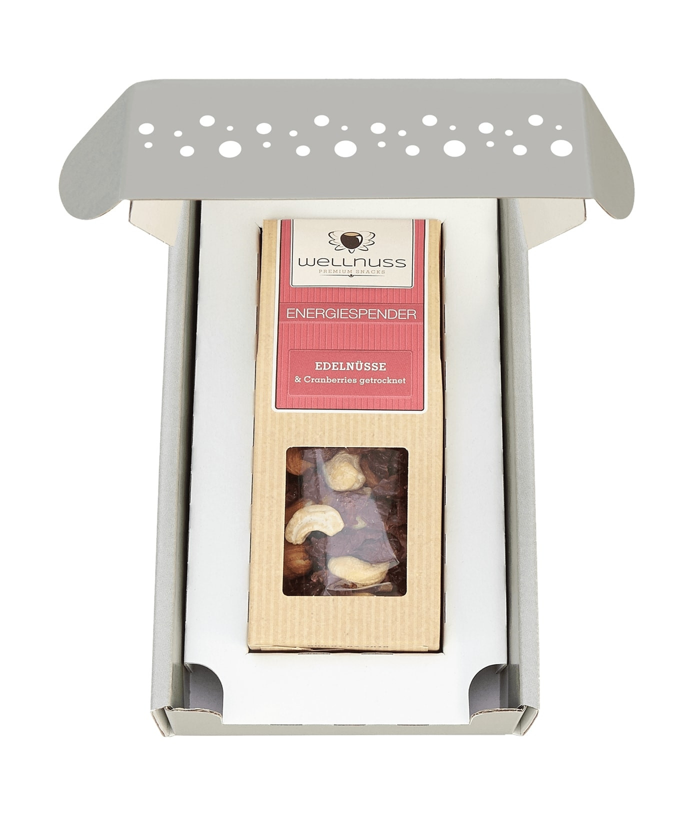 Verschenken Sie dieses Jahr etwas Handgemachtes zu Weihnachten! In Zusammenarbeit mit einer Hamburger Künstlerin hat wellnuss Premium Snacks eine Weihnachts-Sonderedition mit vier handgemalten Motiven kreiert, die Sie einzeln oder im Set bestellen können. Lokale Kunst trifft auf erstklassige Kerne, Trockenfrüchte, Schokolade ... und sicherlich den Geschmack Ihrer Kunden und Geschäftspartner. Denn nicht nur optisch ist das wellnuss-Weihnachtsquartett etwas besonders. Auch der Inhalt ist einzigartig. Denn wir achten bei all unseren Snacks auf höchste Qualität – ohne Konservierungs- oder Farbstoffe, künstliche Aromen und Gentechnik. Versendet wird dieses ganz besondere Weihnachtsgeschenk budgetfreundlich und portooptimiert für Maxibriefe in einem speziellen Versandkarton.