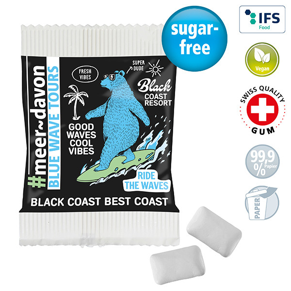 Kaugummi, zuckerfrei, im Papierwerbetütchen verpackt.