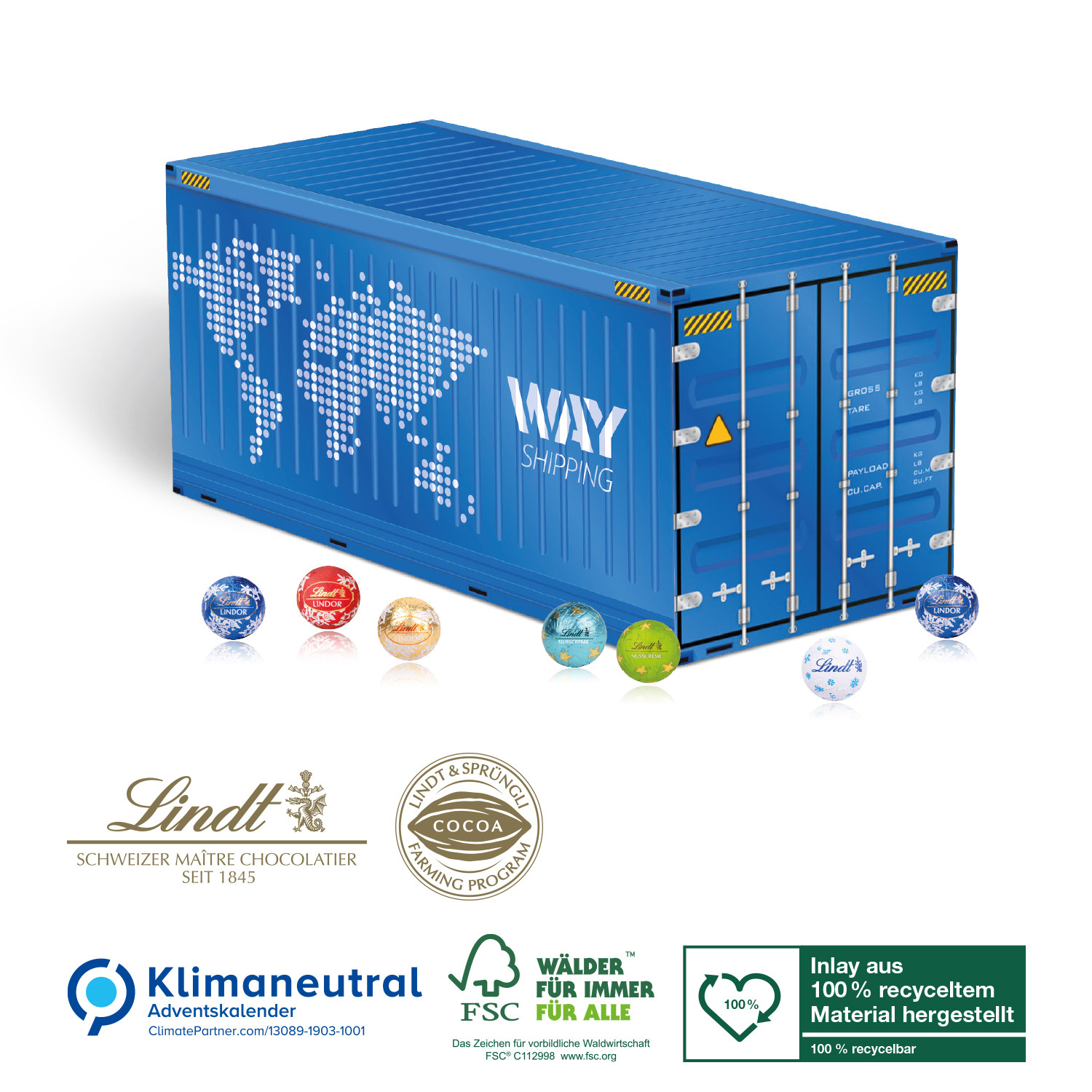 3D Adventskalender Container mit Lindt Lindor, Klimaneutral, FSC®, Inlay aus 100% recyceltem Material