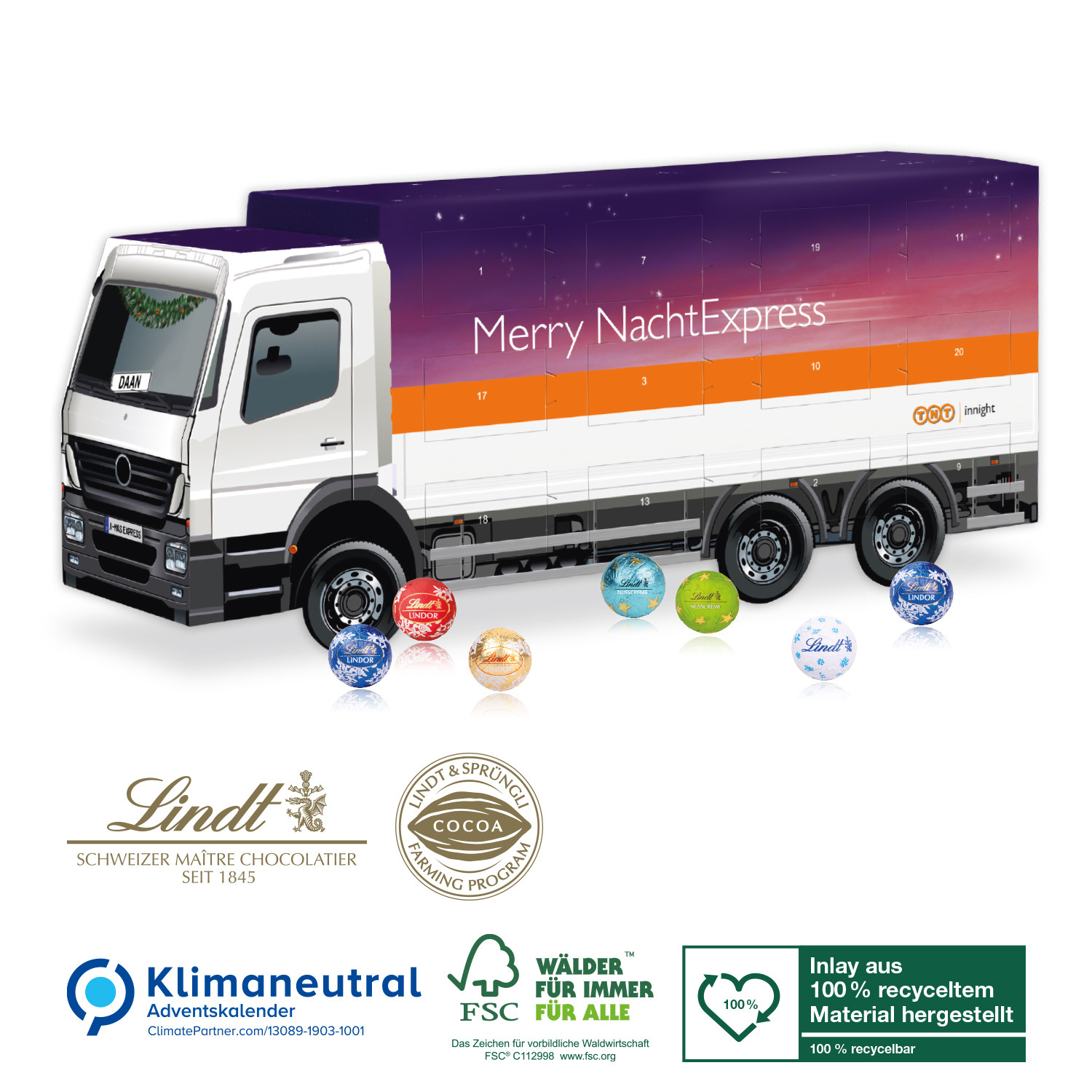 3D Adventskalender LKW mit Lindt Lindor, Klimaneutral, FSC®, Inlay aus 100% recyceltem Material