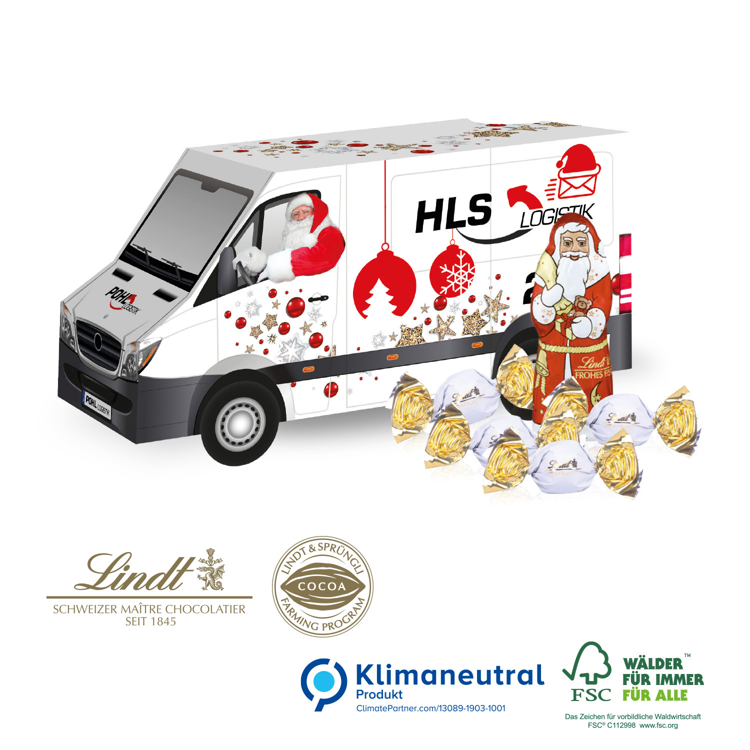 Sympathische Kundenbindung zum attraktiven Preis! Ihr individuell bedruckbares Präsent als „Weihnachtshaus“, „Transporter“, „LKW“, „Camper“ oder „Container“, mit vielen Gestaltungsmöglichkeiten. Gefüllt mit feiner Markenschokolade. Nachhaltigkeit: Klimaneutrales Produkt, gefertigt auf FSC®-zertifiziertem Karton aus nachhaltiger Forstwirtschaft. Das Lindt & Sprüngli Farming-Programm steht für nachhaltige Kakaobohnen-Beschaffung (www.farming-program.com).