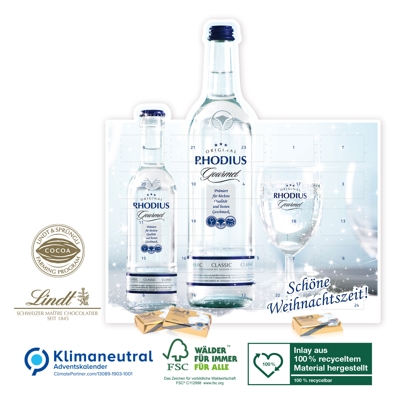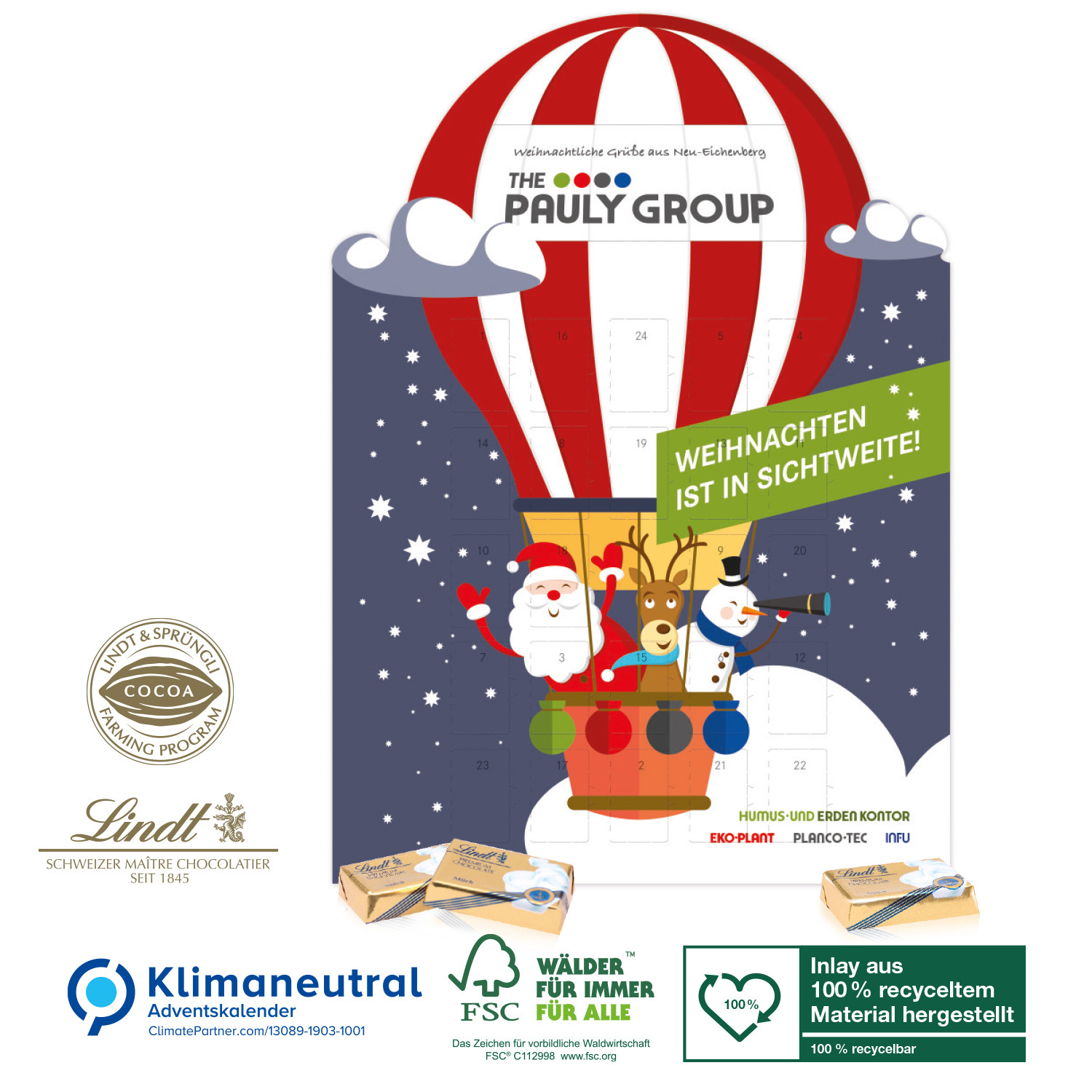 Adventskalender Individuelle Kalenderform mit Lindt Schokotäfelchen, Klimaneutral, FSC®, Inlay aus 100% recyceltem Material