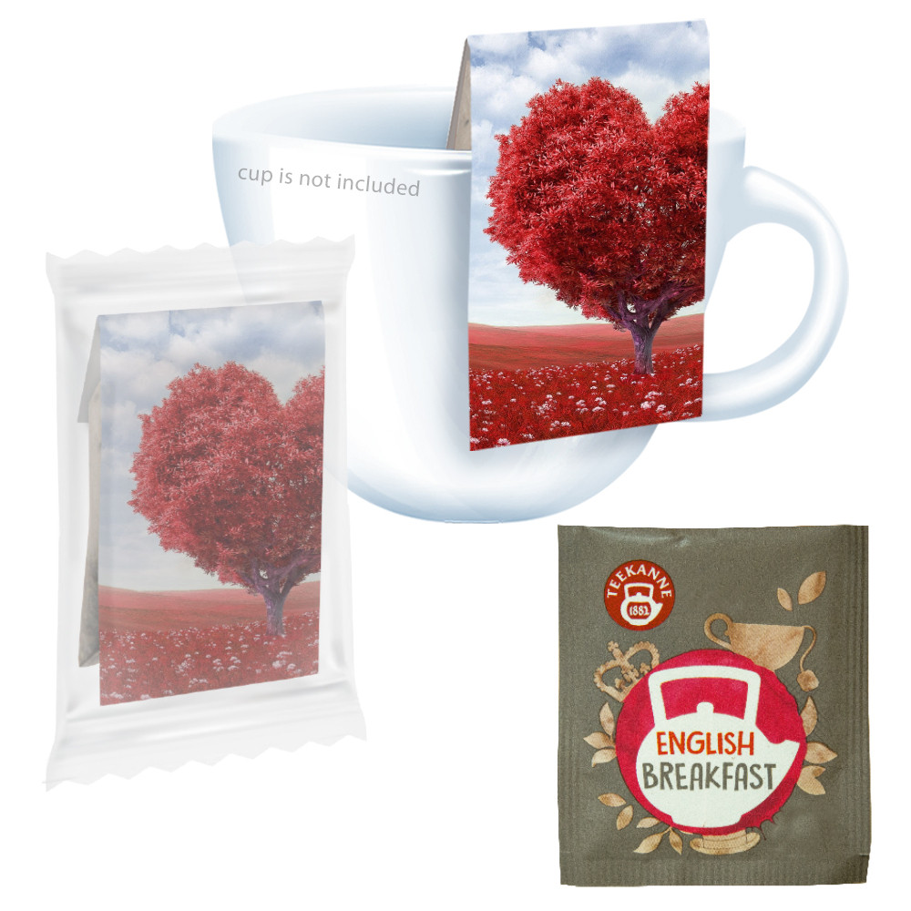 Flowpack aus weißer Folie oder transparenter Folie ohne Weißhinterlegung. Werbeanbringung als Werbereiter in 4c individuell bedruckbar. Zutaten Beuteltee English Breakfast: Schwarztee - Gesamtanteil 100%. Werbeflächengröße: 50 x 90 mm
