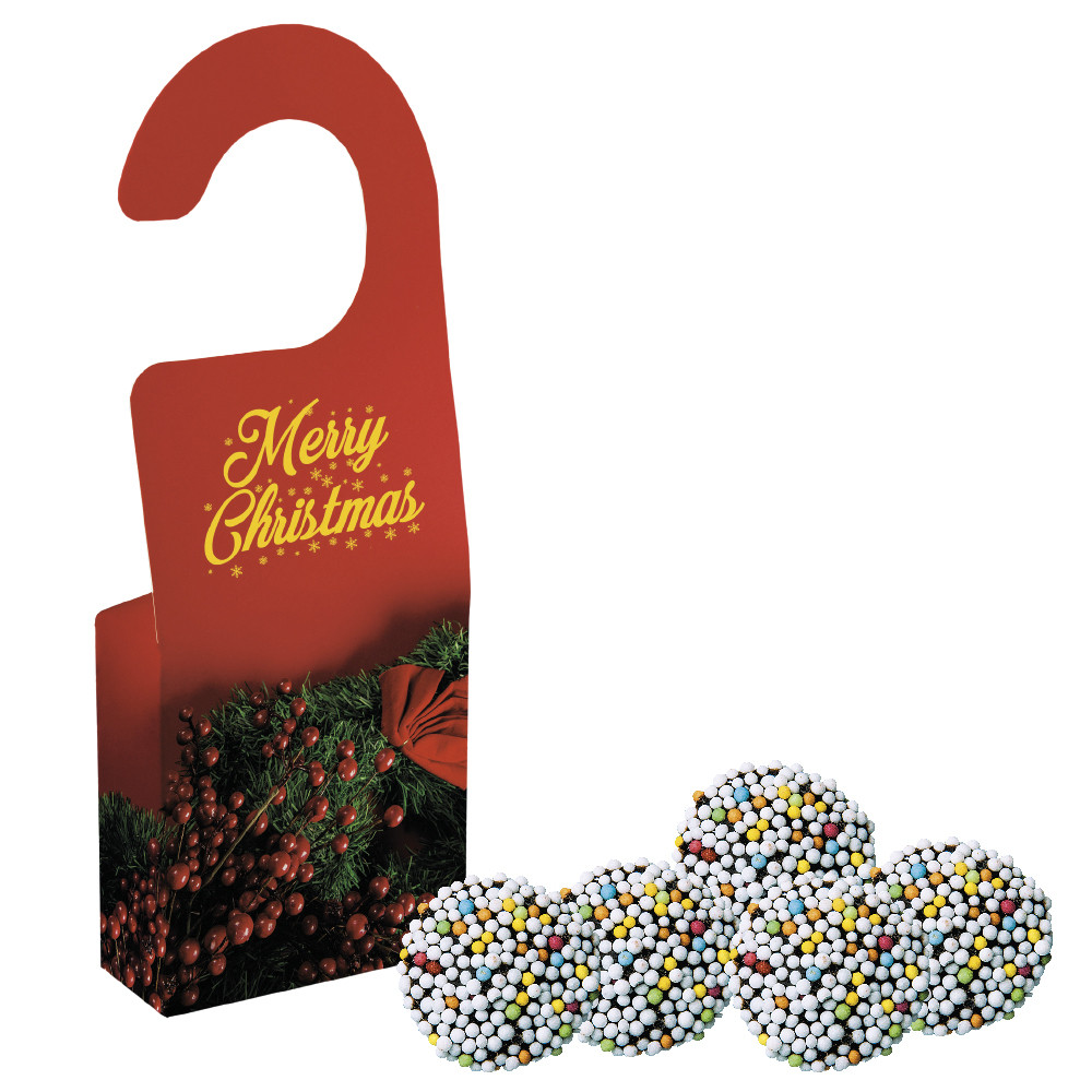 Türhänger Box Faltschachtel. Werbeanbringung als Direktdruck in 4c individuell bedruckbar. Zutaten Bunte Schokotaler: Zucker, Kakaomasse, Weizenstärke, Emulgator: Lecithine, Glukosesirup, Alge, schwarze Johannisbeere; färbende Extrakte aus Zitrone, Saflor, Rettich, Überzugsmittel: Bienenwachs, weiß und gelb. Kann Spuren von Getreide und Nüssen enthalten. Werbeflächengröße: 66 x 175 x 25 mm