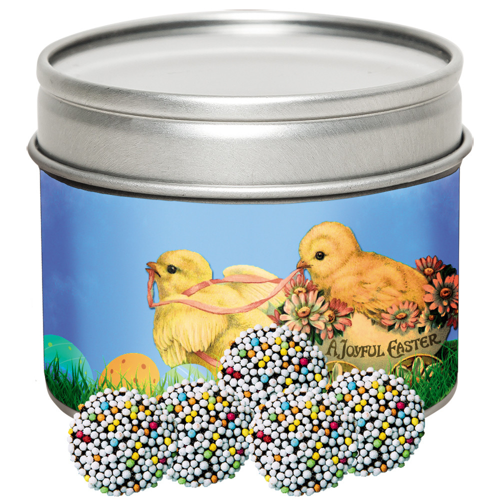 Bunte Schokotaler, ca. 60g, Metalldose mit Sichtfenster
