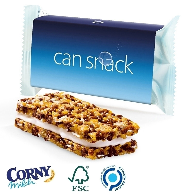 Corny Müsliriegel Milch im Werbeschuber aus weißem, FSC-zertifiziertem Karton, klimaneutral, individuell bedruckt. Inhalt: Müsliriegel der Marke Corny in der Sorte Milch Classic mit dem Plus an Calcium, 30 g. Haltbarkeit: 6 Monate. Preise: Euro / Stück inkl. 4-c Digitaldruck zzgl. Drucknebenkosten. Kühl und trocken lagern.
