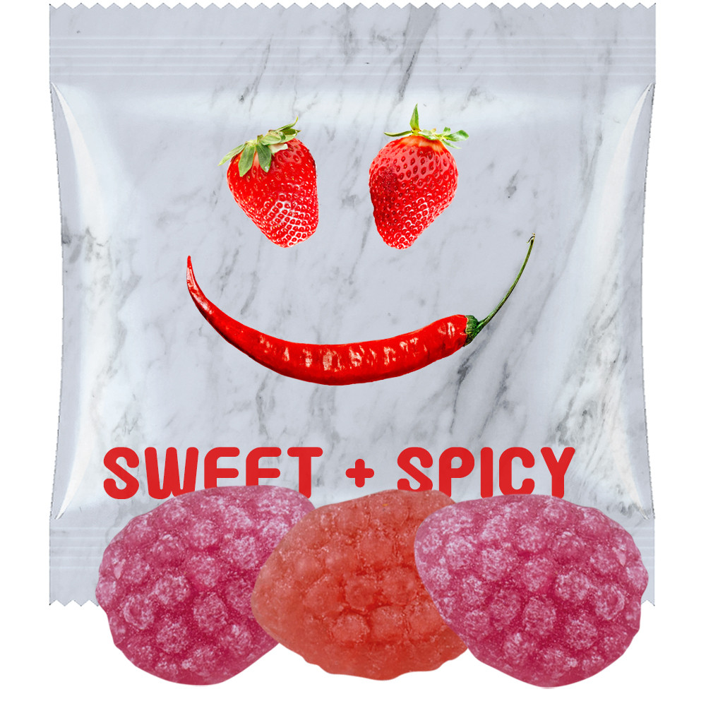 Mini-Tüte aus weißer Folie oder transparenter Folie ohne Weißhinterlegung. Werbeanbringung als Direktdruck in 4c individuell bedruckbar. Zutaten Erdbeer Chili Bonbons: Zucker, Glukosesirup, Säuerungsmittel: Citronensäure; natürliches Aroma, Rote Beete Saftkonzentrat,Capsicum (Chiliextrakt) Werbeflächengröße: 160 x 70 mm