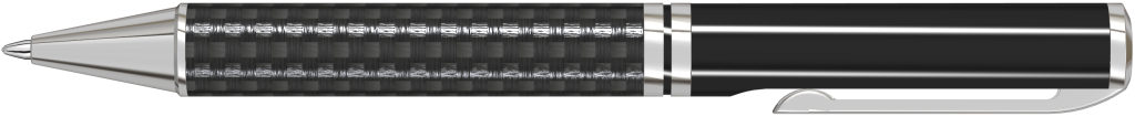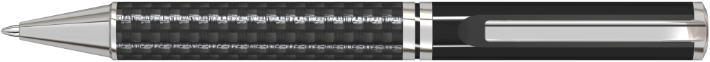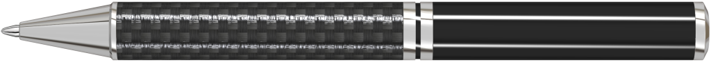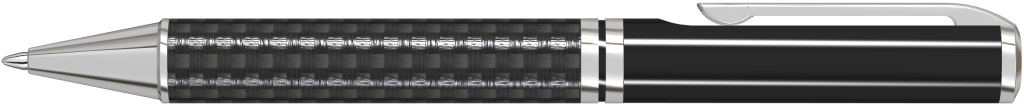 Carbonfaser-Metalldrehkugelschreiber mit zwei eingelassenen silbernen Ringen und Kappe in schwarz. Metallbeschlagteile glanzverchromt.