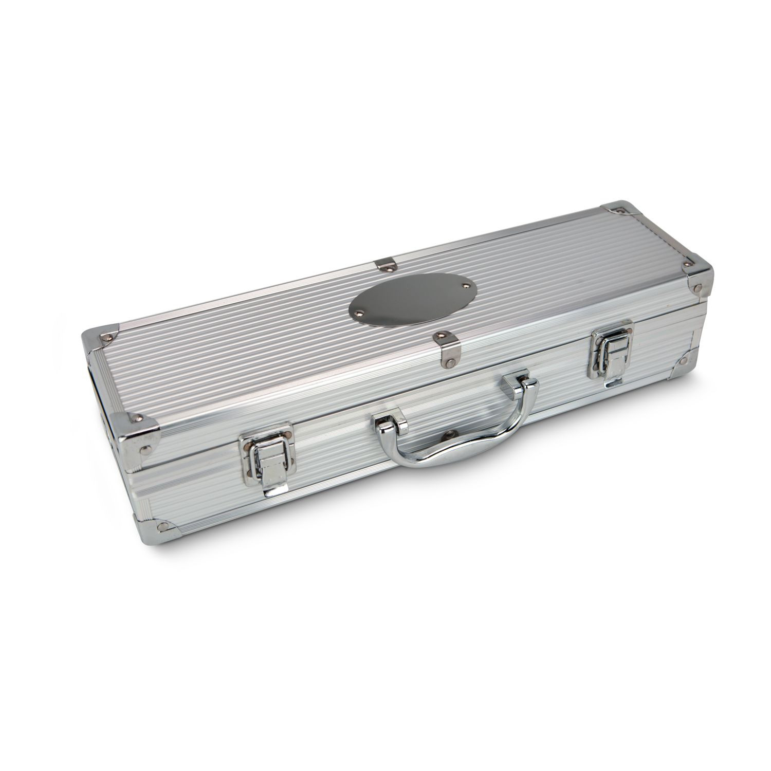 Der Aluminium-Grillkoffer von ROMINOX® enthält alles, was Sie brauchen: Wender, Gabel und Zange aus hochwertigem Edelstahl. Außerdem sind im Set: 0,2 l Chili-Grillöl und 75 g Wajos BBQ-Rub (Grillgewürzmischung). Alles zusammen liegt in einer schwarzen Schmuckwelle mit hellgrünem Dekomaterial und Klarsichtdeckel.