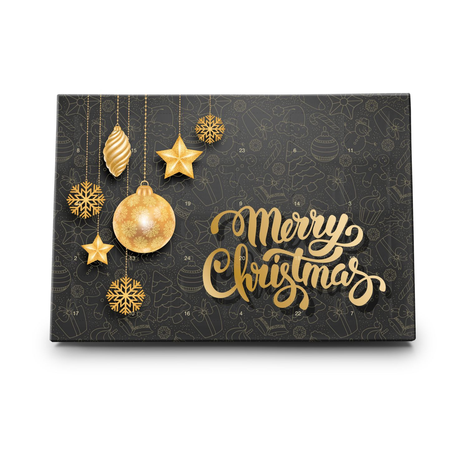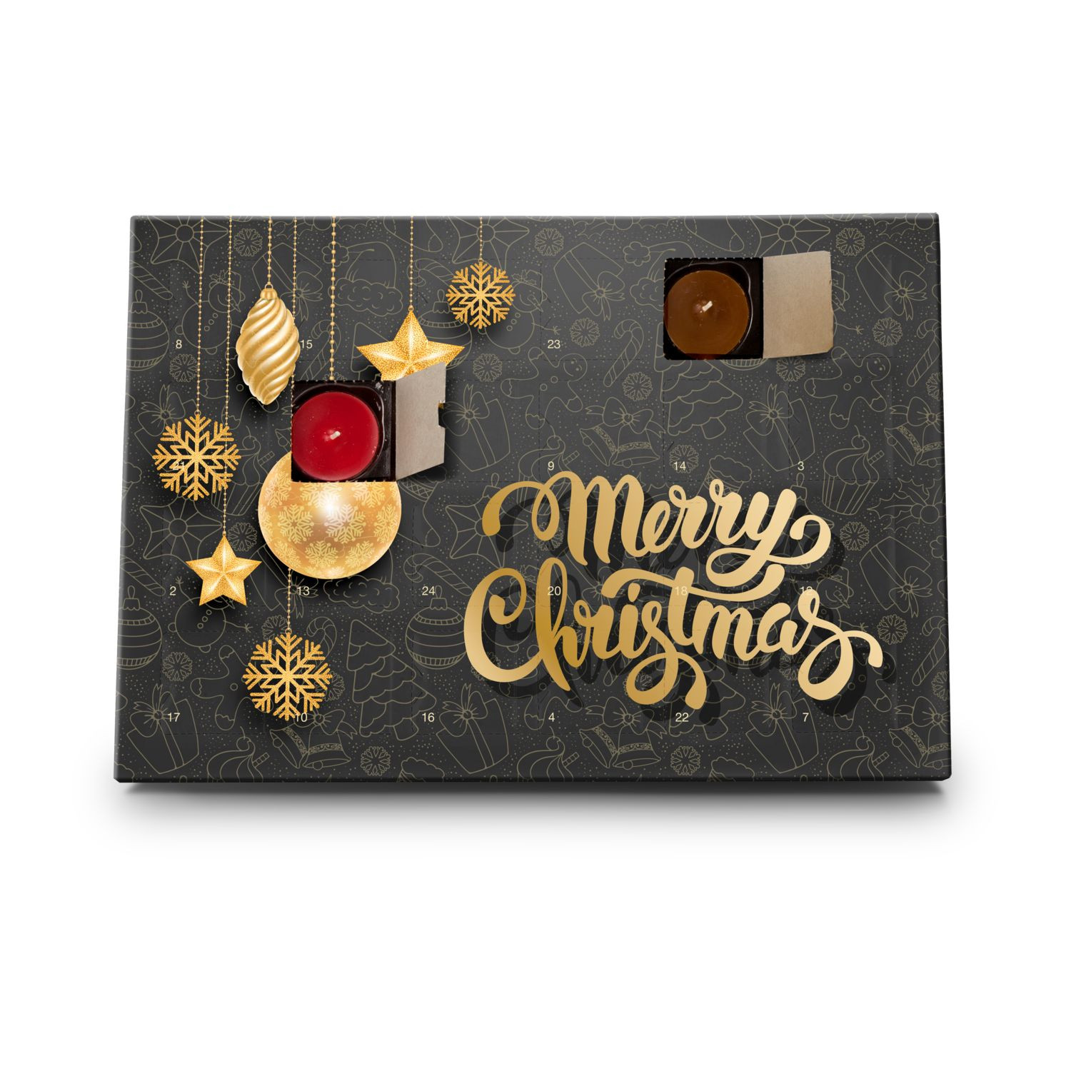 Duftkerzen Adventskalender mit 24 Teelichtern in verschiedenen Duftrichtungen in Kartonage mit schwarz-goldenen Merry Christmas Aufdruck.