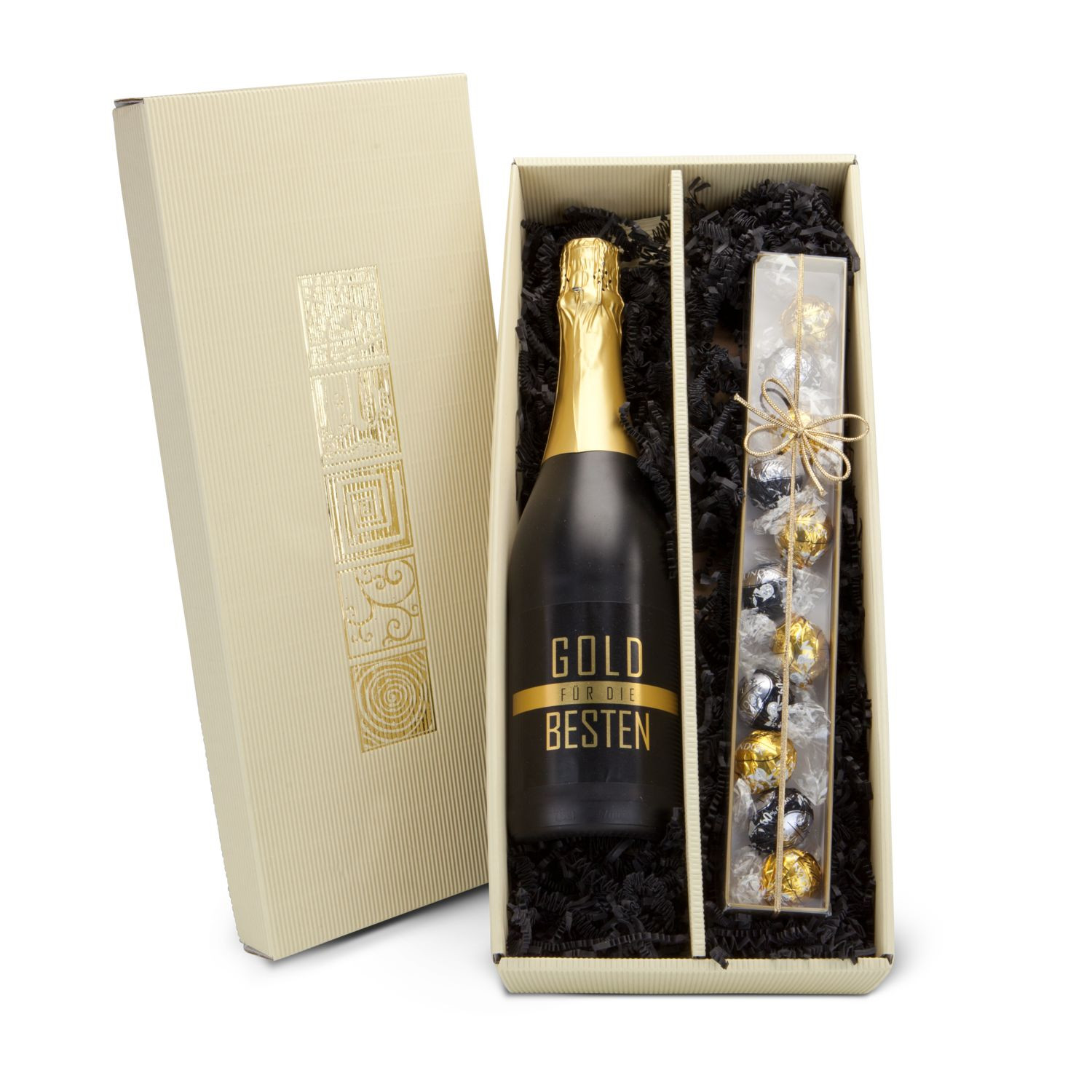 Goldene Momente „für die Besten“ oder andere wertvolle Menschen! Verschenken Sie einen hochwertigen Sekt in matt-schwarzer Flasche (Villa Römer Cuvée 0,75 l) kombiniert mit 6 goldenen und 6 schwarzen Lindt Lindor-Kugeln (ca. 150 g). Dabei ist Schwarz und Gold eine edle Kombination, die Ihre Wertschätzung ideal zum Ausdruck bringen wird. Das Set wird abgerundet durch schwarzes Sizzle und einen schwarzen Karton mit goldener Prägung.