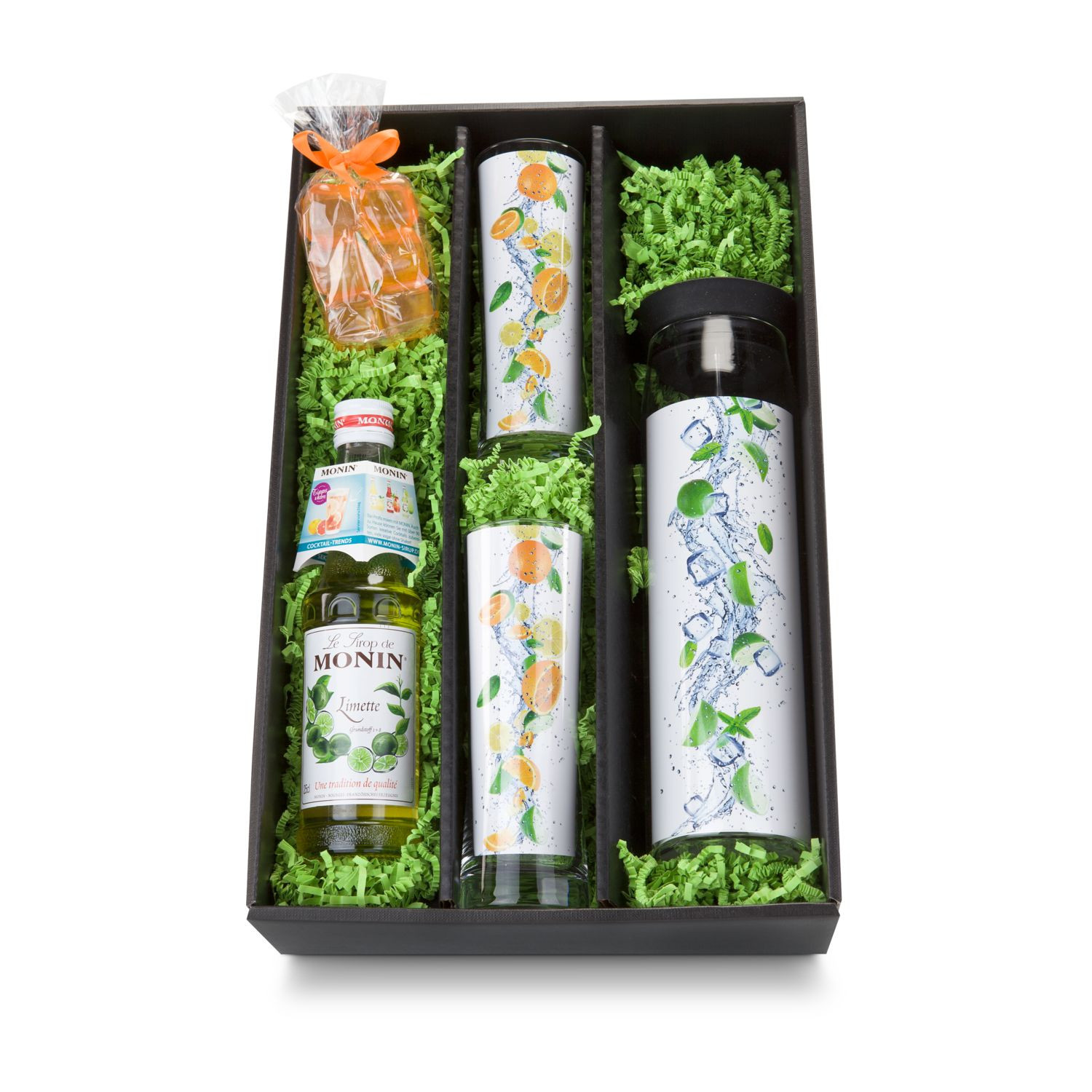 Dieses Set ist etwas für jeden und zu jeder Jahreszeit! Neben einer praktischen ROMINOX® Glaskaraffe (1 l) und 2 passenden Gläsern enthält das Set eine Flasche Sirup Limette (0,25 l) und sechs bunte, wiederverwendbare Eiswürfel im Tütchen. Auf der Rückseite des Karaffeneinlegers befinden sich Rezeptideen für Cocktails und Mocktails. Eine überraschende Idee! Alles liegt optisch wunderschön verpackt in einem Geschenkkarton mit Klarsichtdeckel.
