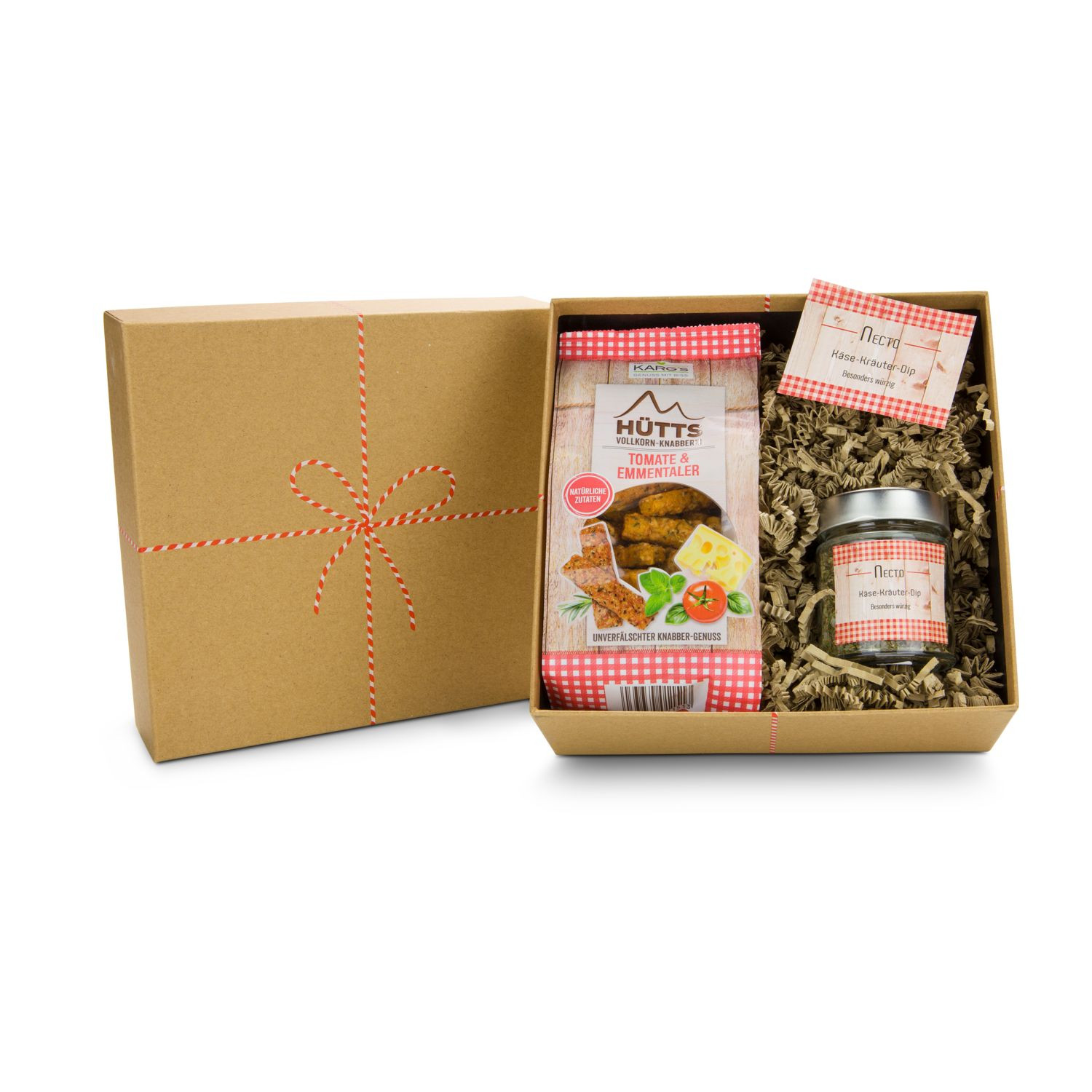 Geschenkschachtel enthält 125 g herzhafte Tomate & Emmentaler Cracker, 35 g Käse-Kräuter-Dip und ein Rezeptkärtchen zur Zubereitung des Dips