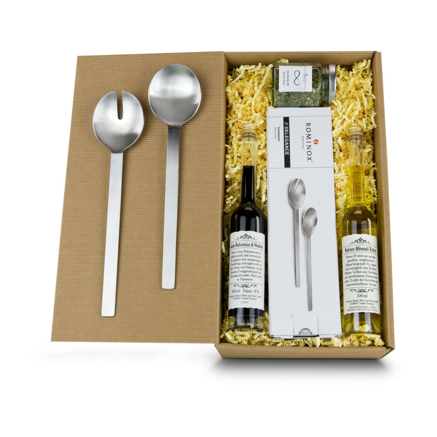 Gesund, fit und lecker präsentiert sich dieser praktisch zusammengestellte, naturfarbene Geschenkkarton. Sie finden darin: ein edles ROMINOX® Salatbesteck aus Edelstahl, harmonisch abgerundet, je 100 ml Aceto Balsamico und Natives Olivenöl Extra, sowie ein Glas mit 35 g Salatkräutern.
