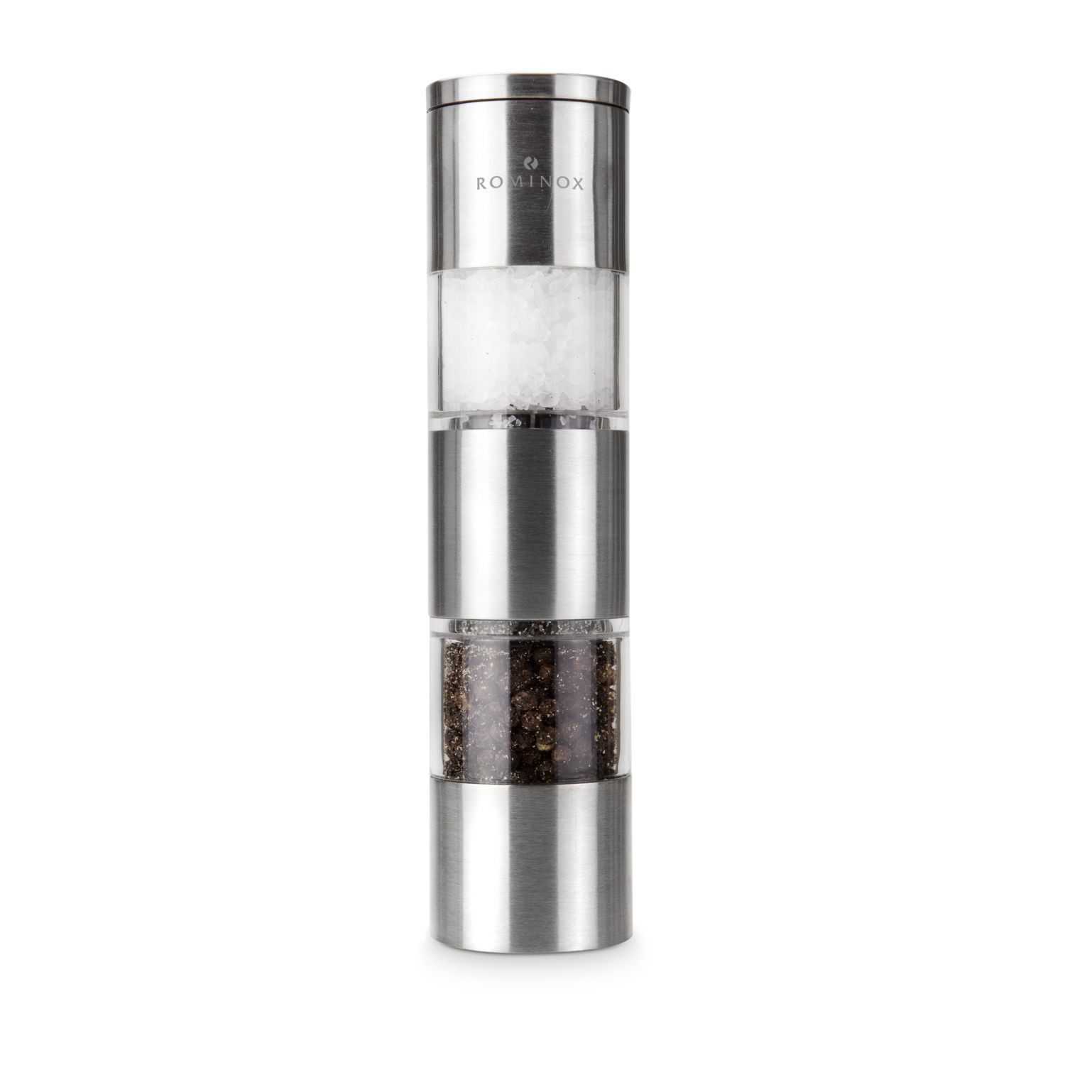Ein kleines Set, das es in sich hat: die elegante kombinierte Salz- und Pfeffermühle von ROMINOX® mit zwei verstellbaren Keramikmahlwerken kann sofort angewendet werden, denn je ein Glas Salz (ca. 40 g) und Pfeffer (ca. 20 g) liegen mit im Geschenkkarton. Eine runde Sache.