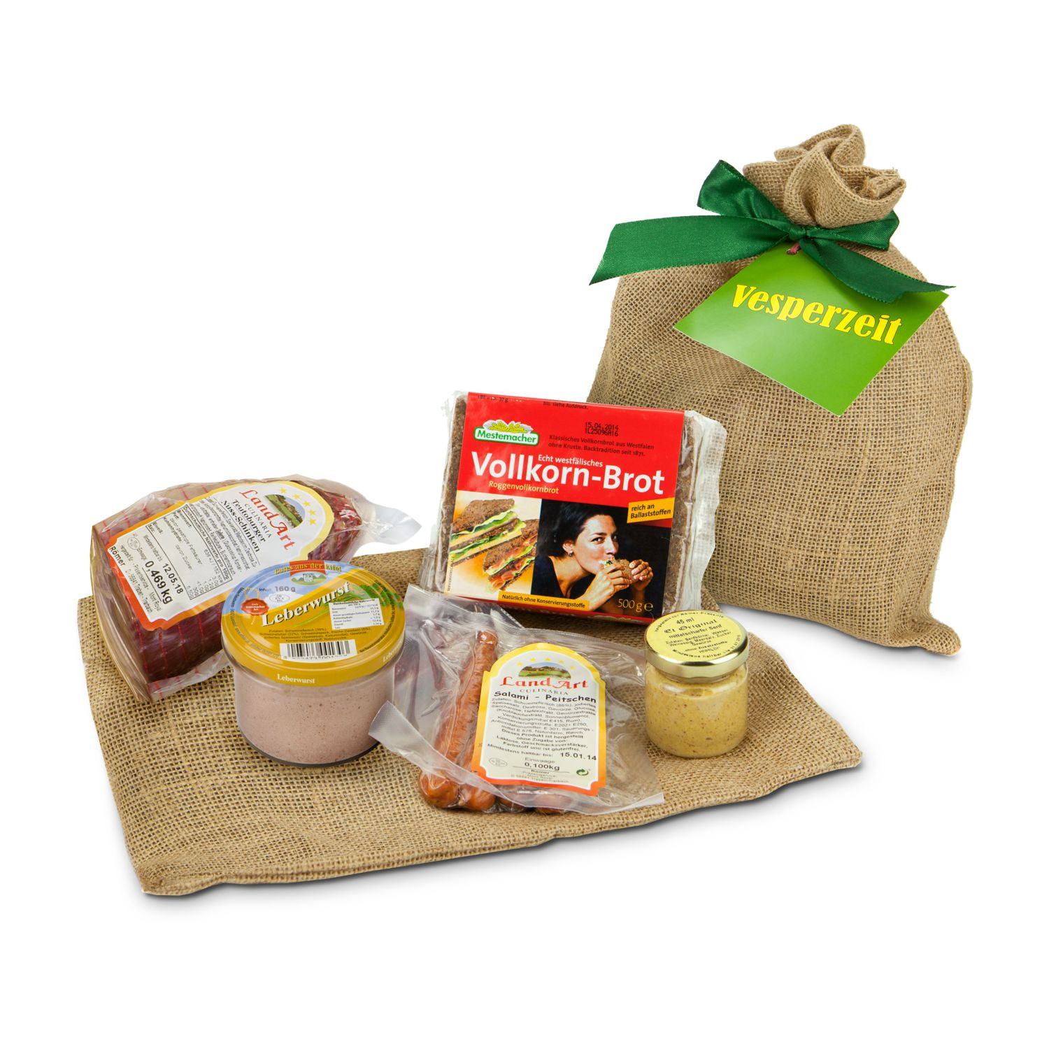 Gönnen Sie Ihren Kunden eine herzhafte Pause mit Leckereien aus deutschen Landen: ca. 200 g Schwarzwälder Schinken, 1 Glas Leberwurst (170 g), 4 Landjäger (125 g), dazu 45 ml Senf und 500 g Vollkornbrot. Verpackt im Jutesack mit schwarzer Kordel.