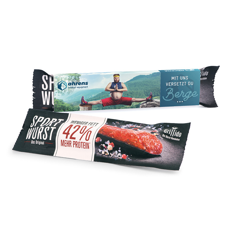 Grillido Sportwurst im Werbeschuber aus weißem, FSC-zertifiziertem Karton, klimaneutral, individuell bedruckt. Inhalt: Mini Salami der Marke Grillido aus 42 % mehr Protein, 25 g. Haltbarkeit: 2 Monate