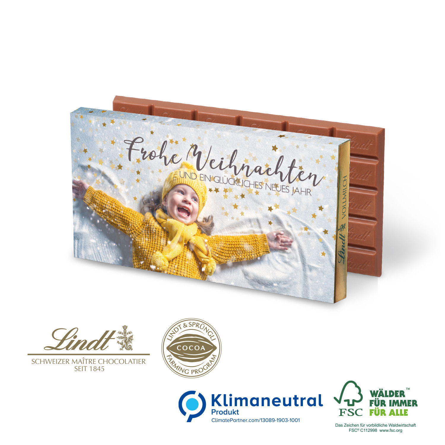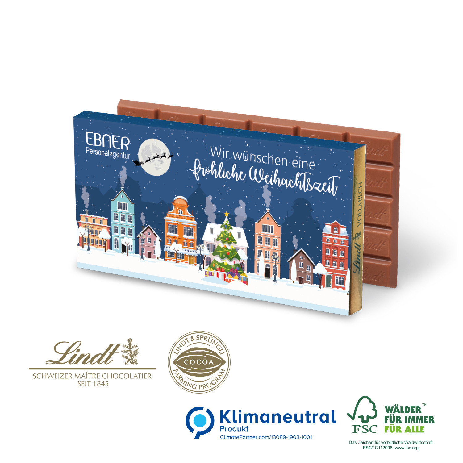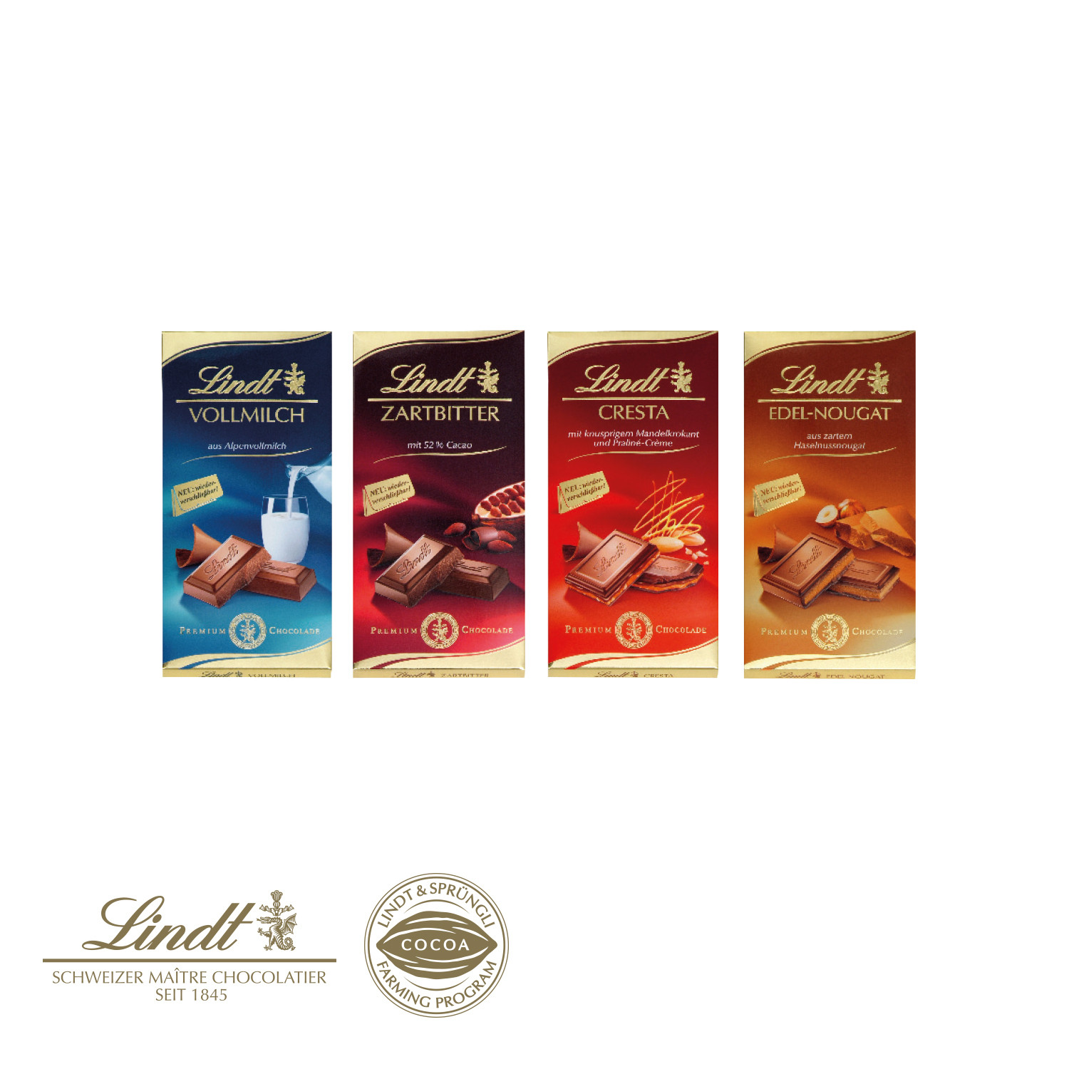 Inhalt 1 Schokoladentafel von Lindt (100 g). Geschmacksrichtungen: Vollmilch, Zartbitter, Cresta oder Edel-Nougat. Saisonale Geschmacksrichtungen auf Anfrage