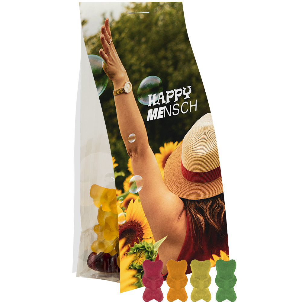 Bio Gummibärchen ohne Gelatine, ca. 40g, Express Blockbodenbeutel mit Werbereiter