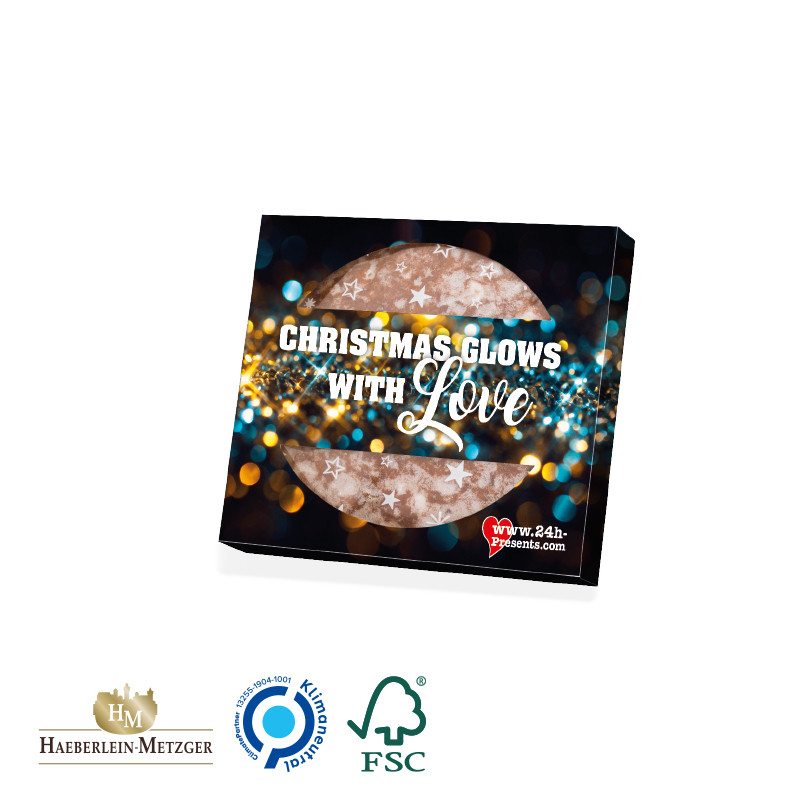Haeberlein-Metzger Elisen Lebkuchen zellophaniert in der Geschenkverpackung aus weißem, FSC-zertifiziertem Karton, klimaneutral, individuell bedruckt Inhalt: Nürnberger Elisen-Lebkuchen der Marke Haeberlein-Metzger, glasiert, 60 g Saisonartikel - solange der Vorrat reicht! Haltbarkeit: Bis mindestens 01.04.2022. Kühl und trocken lagern.