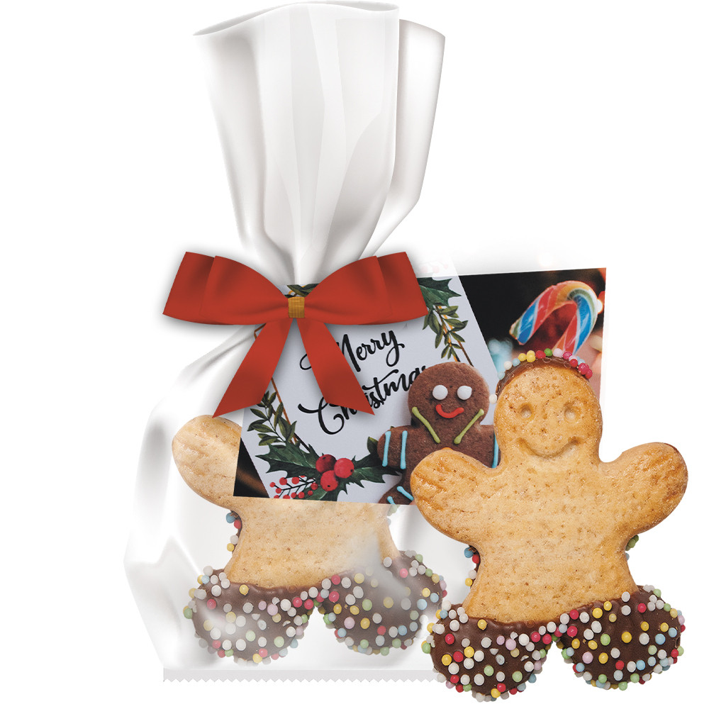 kompostierbarer Flachbeutel aus transparenter Folie. Werbeanbringung als Werbekarte in 4c individuell bedruckbar. Zutaten Happy-Man: Weizenmehl, Zucker, Kartoelstärke, Vollmilchpulver, Palmfett, pfanzliches Fett, Weizenstärke, Magermilchpulver, Molkepulver, Kakaopulver stark entölt (0,5%), Volleipulver, Invertzucker, Glucose Sirup, Emulgator: Rapslecithin; Kakao Masse(0,3%), Salz, Frucht- und Gemüsekonzentrat: Schwarze Johannisbeere, Saflor, Zitrone, Rettich, Süßkartoffel, Bienenwax. Werbeflächengröße: 85 x 55 mm
