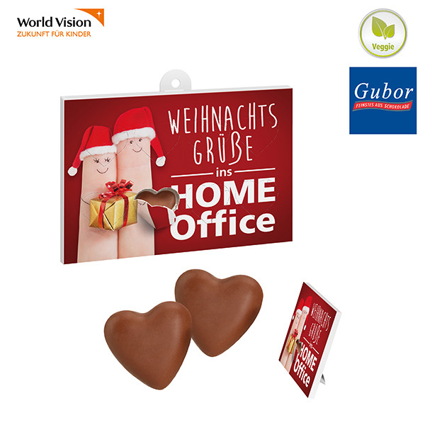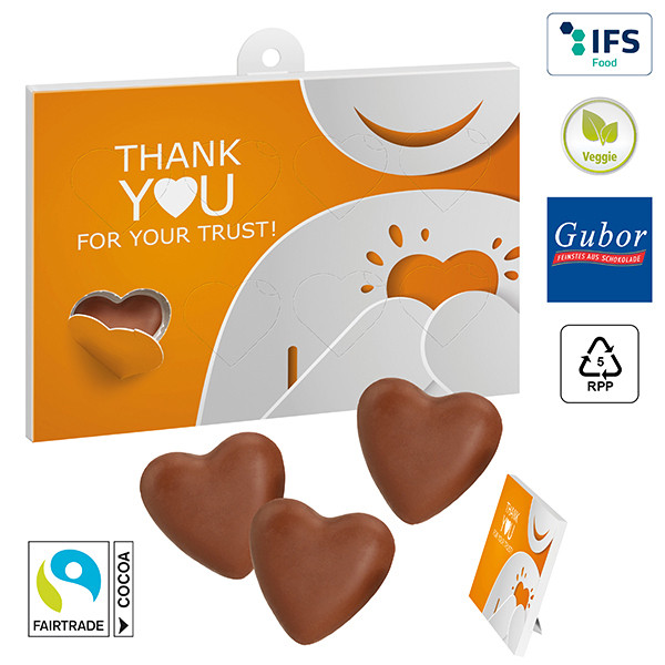 Schokoladenherz-Präsent mit Wandaufhängung und Standfuß im Querformat, 8 Türchen gefüllt mit Herzen aus Vollmilchschokolade mit mindestens 30 % Kakao. Hinweis: Keine Lieferung zwischen Juni und August.