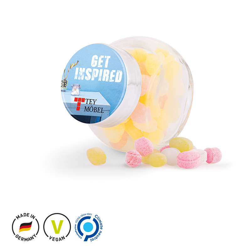 Micro Bonbons im Bonbonglas mit Deckel und edlem Doming Etikett auf dem Deckel, klimaneutral, individuell bedruckt. Inhalt: Micro Bonbons, 30 g. Haltbarkeit: 36 Monate Preise: Euro / Stück inkl. 4-c Euroskala Druck zzgl. Drucknebenkosten. Kühl und trocken lagern.
