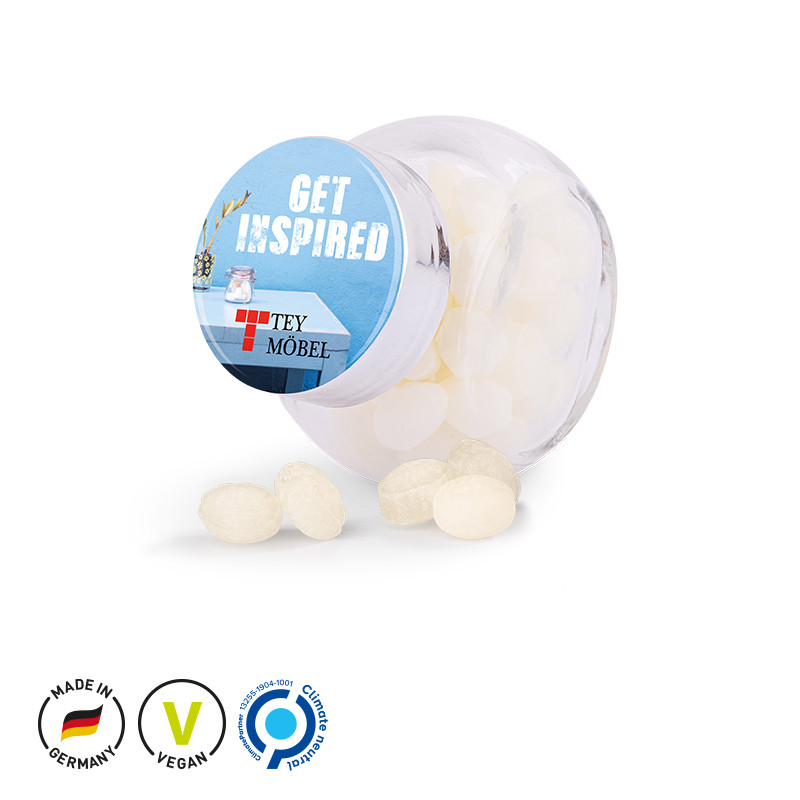 Micro-Bonbons im Bonbonglas mit Deckel und edlem Doming Etikett, weiß, auf dem Deckel, individuell bedruckt. Inhalt: Micro-Bonbons Japanische Minze, 30 g