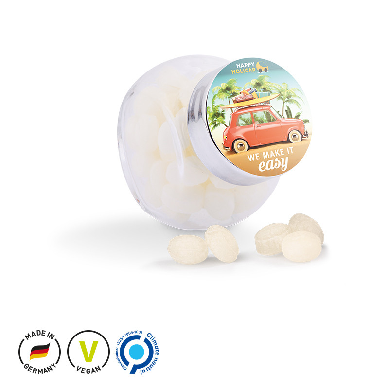 Micro-Bonbons im Bonbonglas mit Deckel und Papieretikett auf dem Deckel, individuell bedruckt. Inhalt: Micro-Bonbons Japanische Minze, 30 g