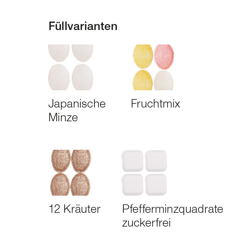 Quadratische Scharnierdeckeldose, weiß aus Metall mit verschiedenen Füllvarianten, klimaneutral, individuell bedruckt Weißblech 98 % recycelbar Inhalt: Micro Bonbons, 25 g; Kaubonbons der Marke Skittles, 25 g; zuckerfreie Pfefferminzpastillen der Marke Pfeffi, 20 g; Traubenzuckerquadrate in der Geschmacksrichtung Himbeere, 20 g oder Schokolinsen der Marke M&M's, 25 g Haltbarkeit: Bonbons: 36 Monate Kaubonbon: 12 Monate Pfefferminz: 18 Monate Traubenzucker: 18 Monate Schokolinsen: 4 Monate. Preise: Euro / Stück inkl. 4-c Euroskala Druck zzgl. Drucknebenkosten. Kühl und trocken lagern.