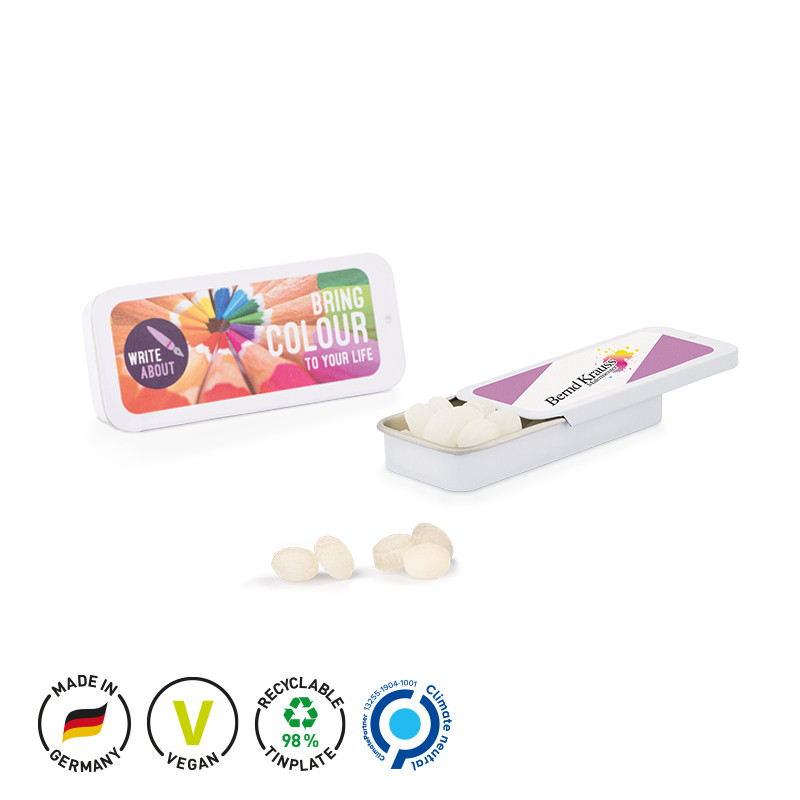Flache weiße Schiebedeckeldose, aus Weißblech 98% recylebar, individuell bedruckt. Inhalt: Micro-Bonbons Japanische Minze, 13 g,