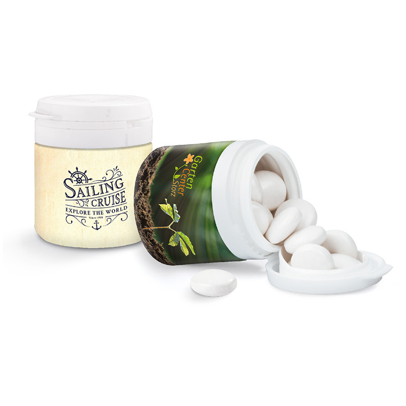 Dose aus weißem Kunststoff und transparentem Sleeve mit verschiedenen Füllvarianten, klimaneutral, individuell bedruckt Mit Originalitätsverschluss Inhalt: Mini Bonbons, 40 g; zuckerfreie Kaugummis (Pfefferminz) der Marke Mentos, 35 g; Kaudragee (Mint oder Fruit) der Marke Mentos, 45 g oder zuckerfreie Pfefferminzpastillen der Marke Pfeffi, 35 g Haltbarkeit: 18 Monate. Preise: Euro / Stück inkl. 4-c Euroskala Druck zzgl. Drucknebenkosten. Kühl und trocken lagern.