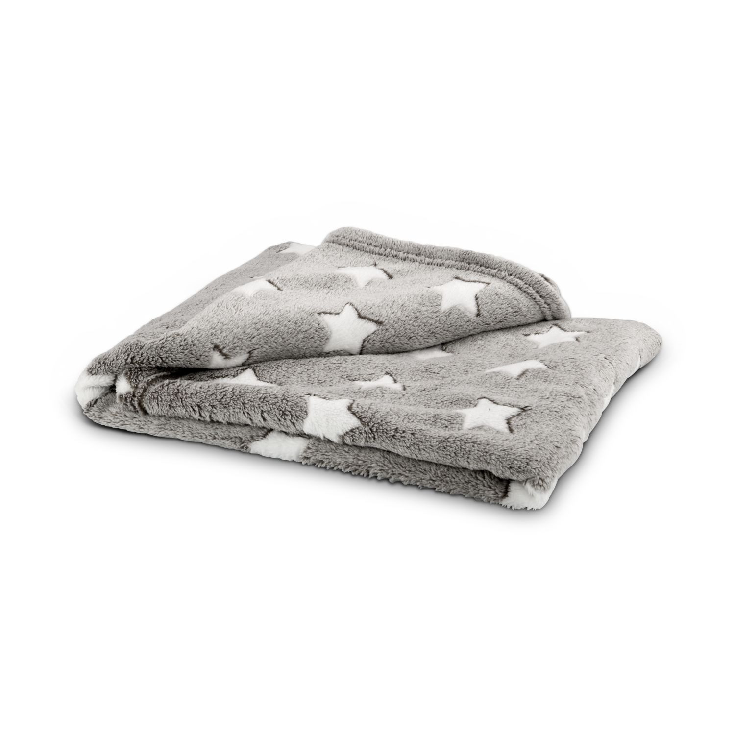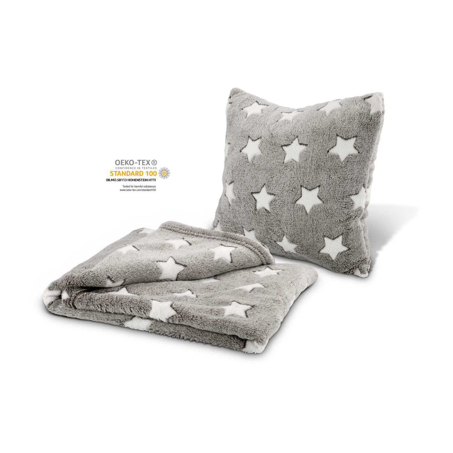 Flauschige Decke in Größe 150 x 200 cm und Kissen in 45 x 45 cm mit Reißverschluss aus 100% Polyester in modernem, grauen Design mit weißen Sternen. Kissenbezug abnehmbar und waschbar. Ein tolles Geschenk für Groß und Klein! Qualität: 250 g/m² (Zertifiziert nach STANDARD 100 von OEKO-TEX®)