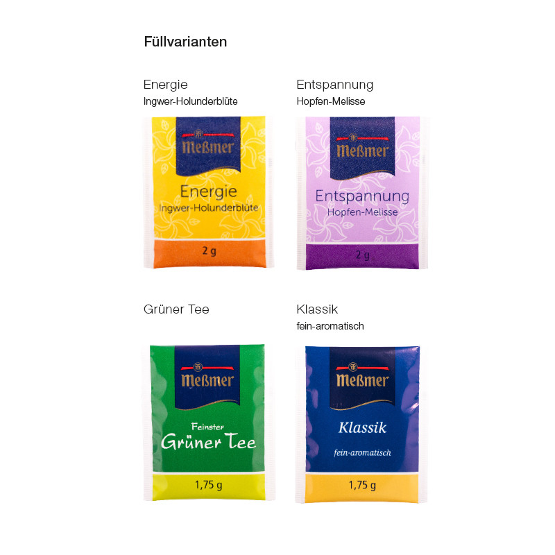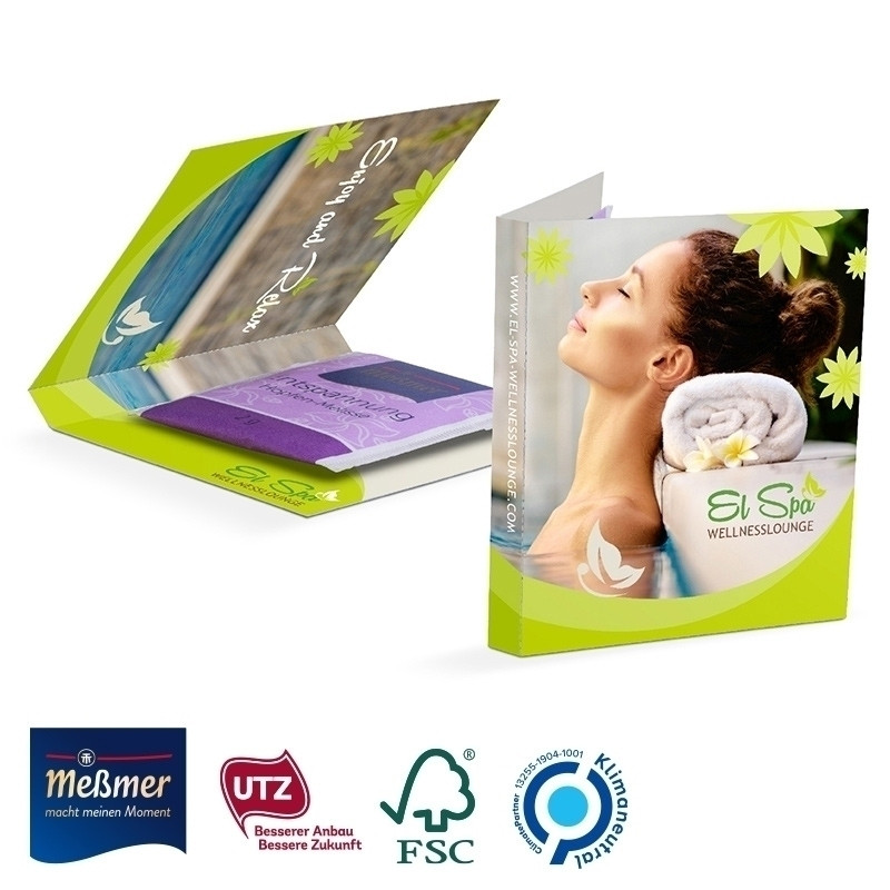 Meßmer Teebeutel in aufklappbarer Werbekarte aus weißem FSC-zertifiziertem Karton mit praktischer Abreißperforation, klimaneutral, individuell bedruckt. Inhalt: Teebeutel der Marke Meßmer in den Sorten Klassik, Grüner Tee, Energie, Entspannung (nur sortenrein). Haltbarkeit: 12 Monate Preise: Euro / Stück inkl. 4-c Euroskala Druck zzgl. Drucknebenkosten. Kühl und trocken lagern.