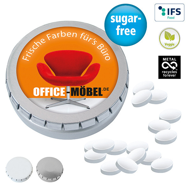 Metalldose weiß oder silberfarben, rund, wiederbefüllbar, einzeln gesleevt mit roter Aufreißhilfe.