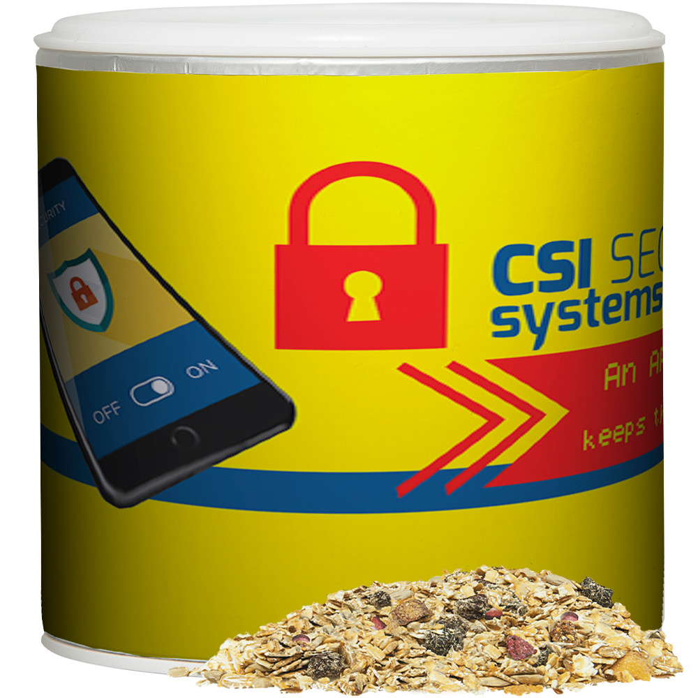 Pappdose Small mit Aufreißmembrane. Werbeanbringung als Etikett in 4c individuell bedruckbar. Zutaten Müsli Sauerkirsch: Haferflocken fein, Roggenflocken, Gestenflocken, Weinbeeren, Leinsaat braun, Sonnenblumenkerne, Vollkorn-Cornflakes; Sauerkirschen gefriergetocknet; Werbeflächengröße: 245 x 68 mm
