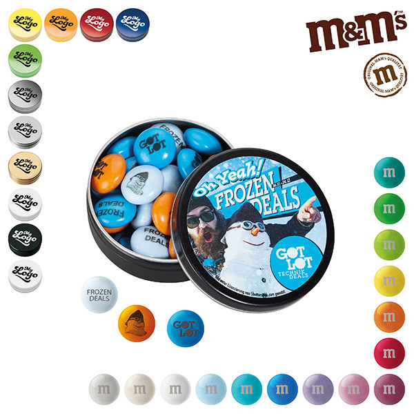 Personalisierte M&M’S® Schokolinsen mit individuellem Druck auf den Linsen und verpackt in wiederbefüllbarer Metalldose, einzeln gesleevt mit roter Aufreißhilfe. Drucken Sie nicht nur Texte (maximal 2 Zeilen zu je 9 Zeichen), sondern auch Bilder oder Logos variabel kombiniert auf 1, 2 oder 3 verschiedenfarbigen Schokolinsen. Insgesamt stehen 15 Linsenfarben und 11 Dosenfarben zur Wahl.