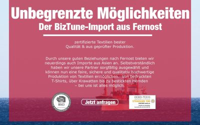 BizTune und Asien. Neben unserem stetig wachsenden Sortiment ergeben sich auch immer neue Möglichkeiten bei BizTune. Wir können nun bei Großaufträgen im Bereich Textilien unsere guten Beziehungen nach Bangladesch nutzen und beste Qualität sehr preiswert anbieten. Wir...