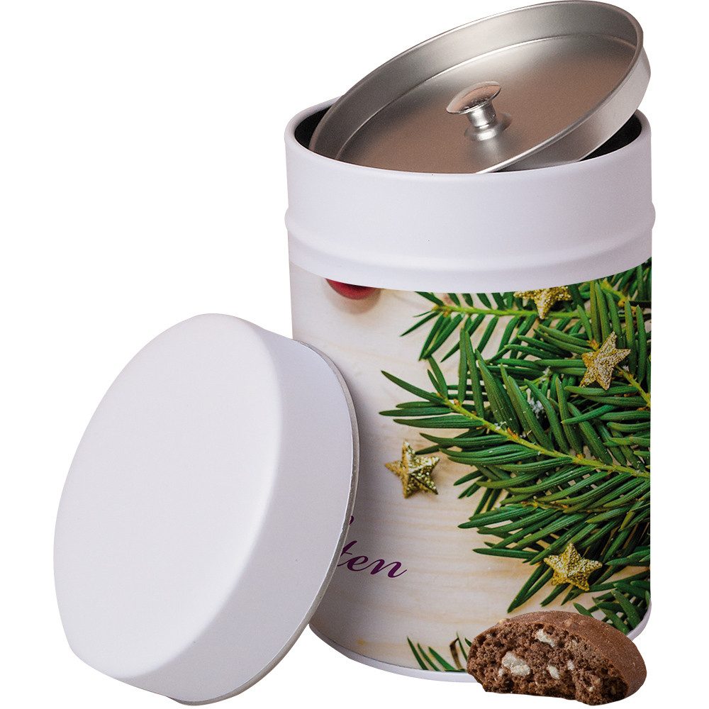 Metalldose Maxi aus Metall. Werbeanbringung als Etikett in 4c individuell bedruckbar. Zutaten Paracini: Dinkelmehl¹ (43%), Rohrohrzucker, Paranüsse (17%), Sonnenblumenöl, Quinoa (2%), fettarmer Kakao, Backtriebmittel: Ammoniumcarbonate, Meersalz, Vanille, Zimt. Kann Spuren von Sesam und Schalenreste enthalten. Werbeflächengröße: 285 x 85 mm