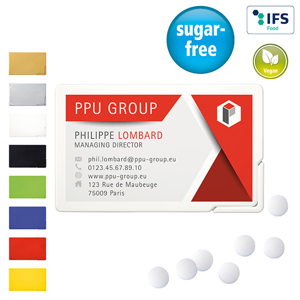 Pfefferminz-Karte aus weißem Kunststoff mit Öffnungsklappe über Eck, befüllt mit zuckerfreien Pfefferminzpastillen, rund, Ø 7 mm, wiederbefüllbar.
