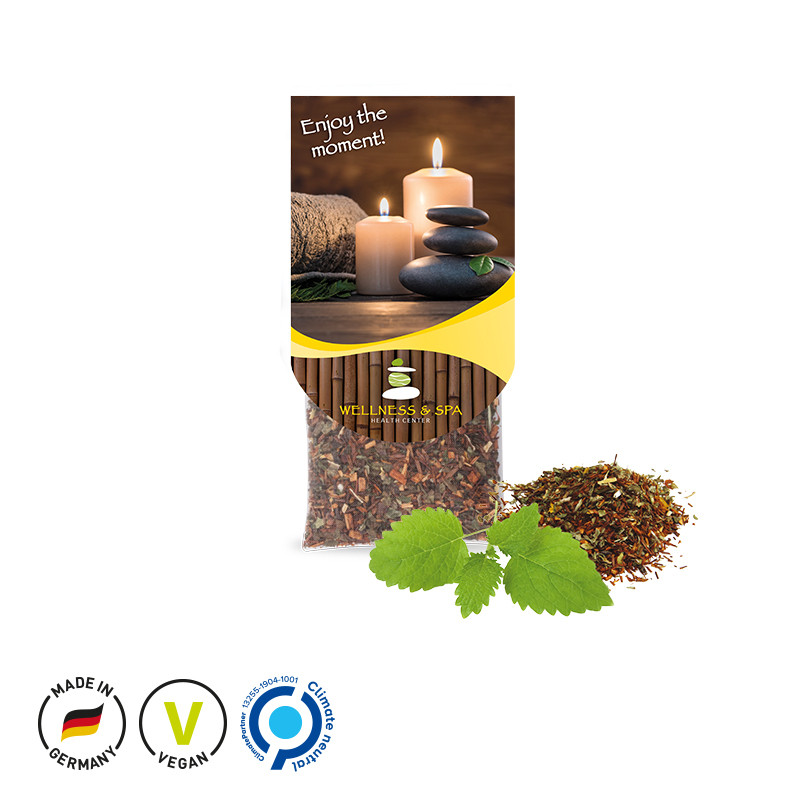 Premium Tee mit auffälligem Tassenreiter, klimaneutral, individuell bedruckt im transparenten Vierrand-Siegelbeutel. Inhalt: 1 Tee-Aufgussbeutel Nylonbeutel (sortenrein). Haltbarkeit: 18 Monate.Sorten: Feel Relaxed – Kräutertee, Passion – Grüner Tee, English Breakfast – Schwarzer Tee, Früchtetee mit Himbeergeschmack. Preise: Euro / Stück inkl. 4-c Euroskala Druck zzgl. Drucknebenkosten. Kühl und trocken lagern.