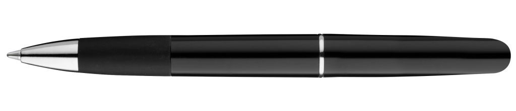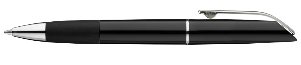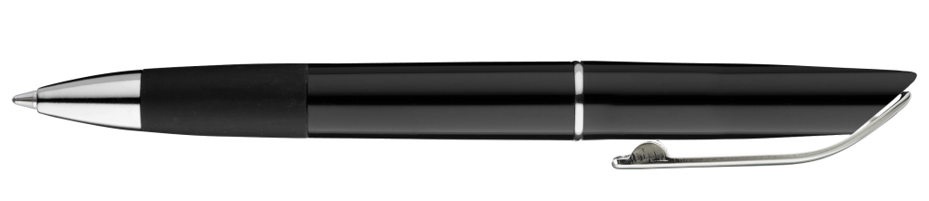 Drehkugelschreiber mit gedeckt glänzendem Gehäuse und Gummigriffzone in schwarz. Metallclip, Zierring und Metallspitze glanzverchromt.