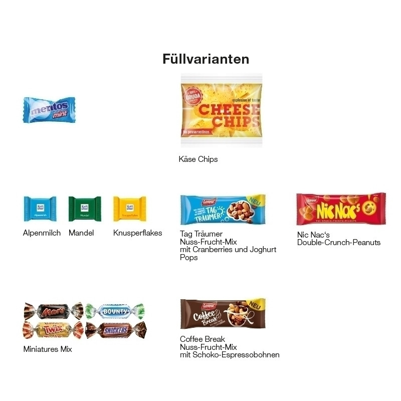 Gegen Aufpreis: Käse Chips mit Standardgestaltung, 10 g; zwöf Schokotäfelchen der Marke Ritter SPORT, gemischt, 60 g; Erdnüsse im Teigmantel der Marke Lorenz, 40 g; Nuss-Frucht Mix mit Schoko-Espressobohnen der Marke Lorenz, 40 g; Nuss-Frucht Mix mit Cranberries und Joghurt Pops der Marke Lorenz, 40 g oder vier Lindor Milch Kugeln der Marke Lindt & Sprüngli, 50 g