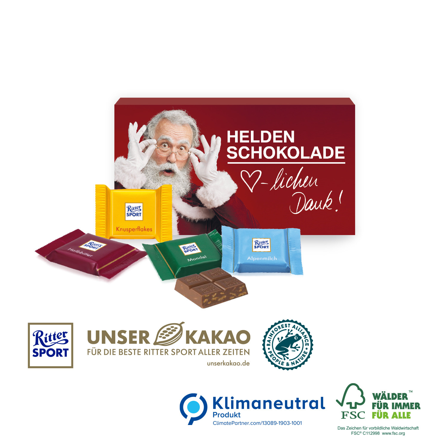 Bunter Schokoladengenuss werbestark verpackt! Ob Alpenmilch, Mandel, Knusperflakes oder Halbbitter: Mit 30% bis 50% Kakaogehalt versprechen die kleinen Leckerbissen größten Schokoladengenuss. Nachhaltigkeit: Klimaneutrales Produkt, gefertigt auf FSC®-zertifiziertem Karton aus nachhaltiger Forstwirtschaft. Ritter SPORT bezieht Rainforest Alliance-zertifizierten, nachhaltigen Kakao (www.unserkakao.de).