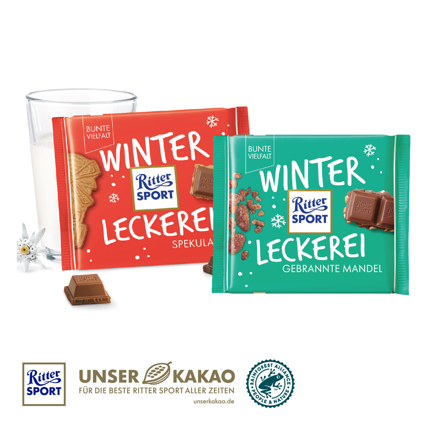 Winter-Schokolade: Maximal lecker! Pünktlich zur kalten Jahreszeit präsentieren sich die Tafeln „Gebrannte Mandel“ und „Spekulatius“ so lecker, dass jedem Schokoladen-Fan schon beim Anblick ganz warm ums Herz wird. Nachhaltigkeit: Klimaneutrales Produkt, gefertigt auf FSC®-zertifiziertem Karton aus nachhaltiger Forstwirtschaft. Ritter SPORT bezieht Rainforest Alliance-zertifizierten, nachhaltigen Kakao (www.unserkakao.de).