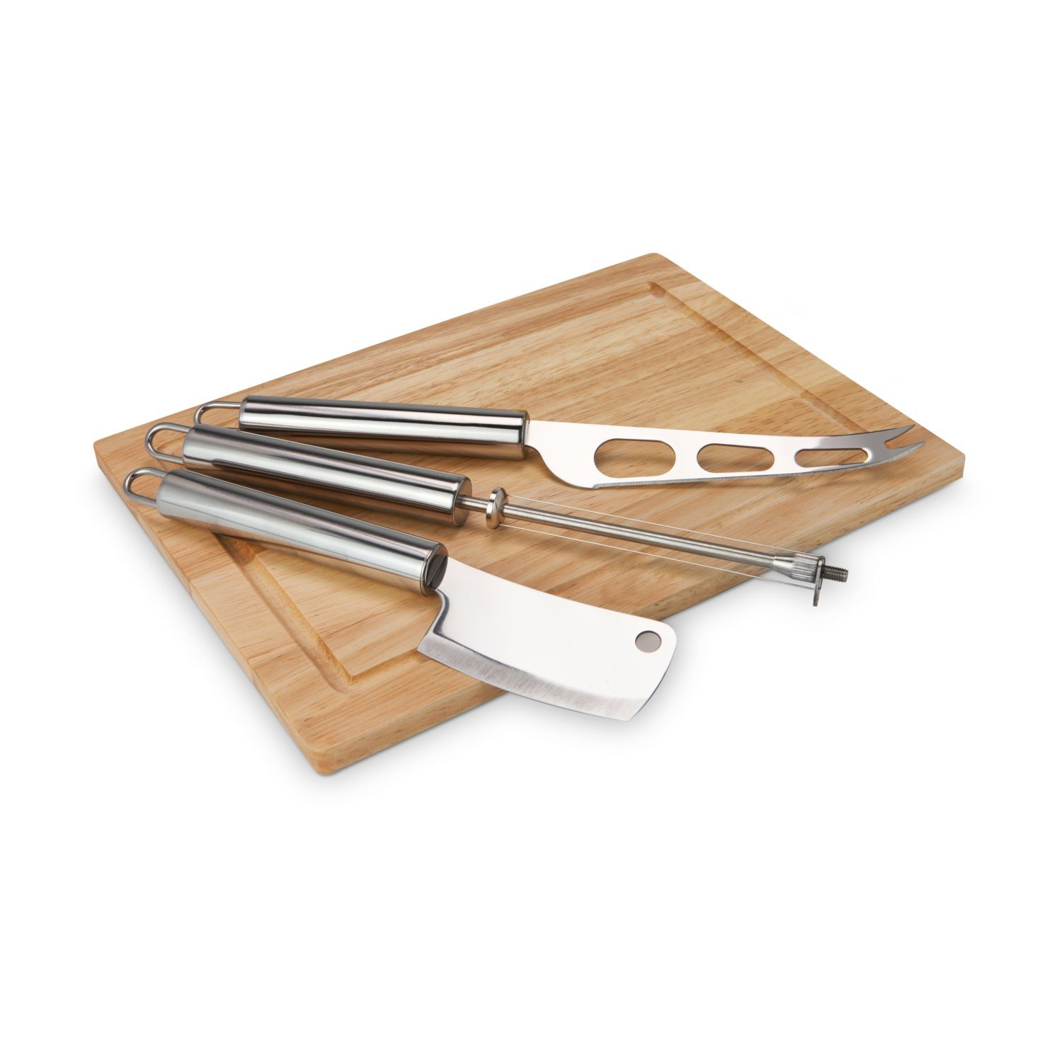 Grundausstattung für Käseliebhaber, massives Holzbrett, Käsemesser, Beil und Fadenschneider (Holz, Edelstahl - seidenmatt gebürstet)