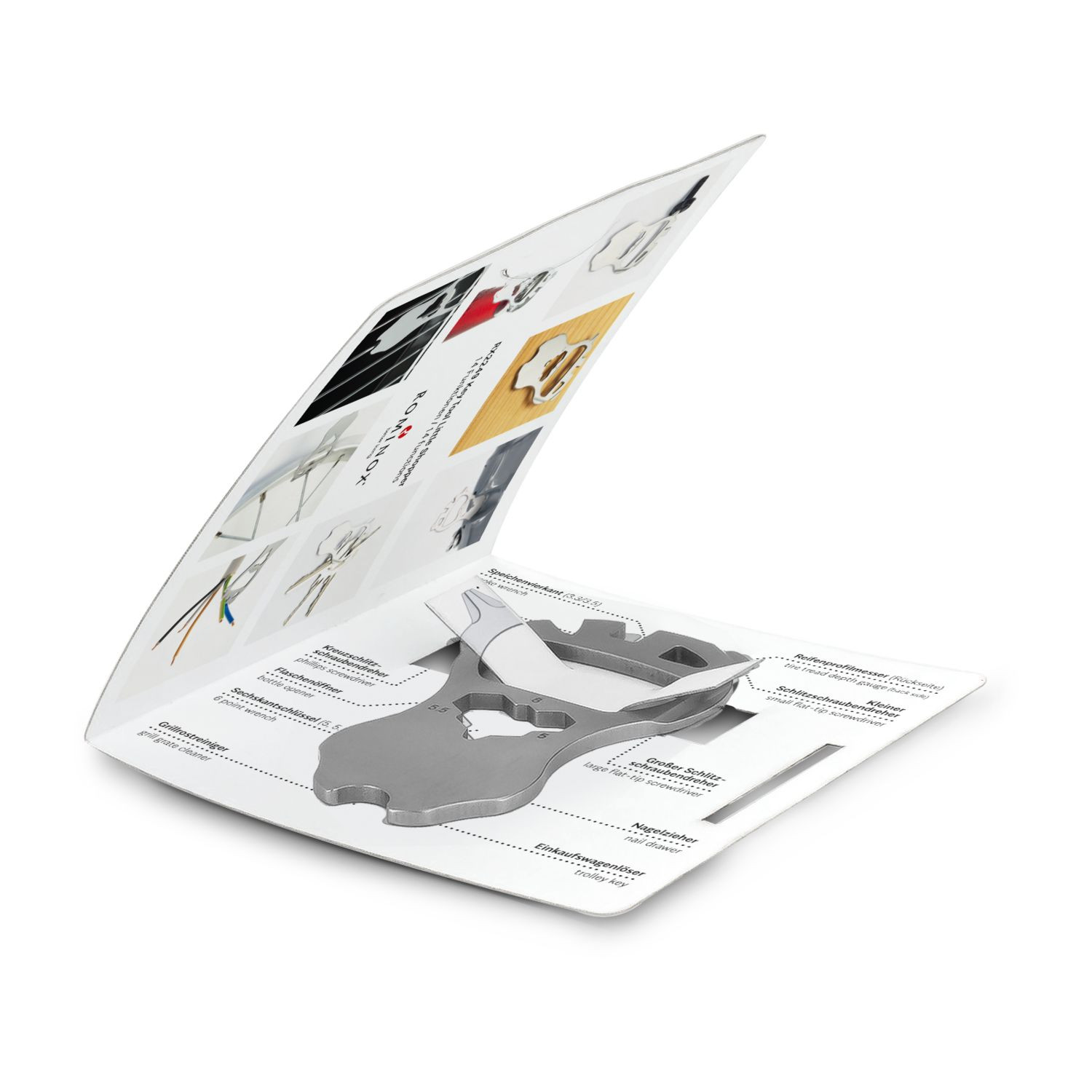 Die praktischen ROMINOX© Multitools gibt es jetzt auch als Mini-Helfer für den Schlüsselbund! Klein, leicht und doch vielseitig überzeugen die Mini-Werkzeuge im Alltag. Robuster Werkzeugstahl, inkl. Funktionsbeschreibung und Standard-Kartonverpackung, kundenindividuelle Verpackung ab 100 Stück möglich (Werkzeugstahl). In zwei Designs verfügbar. Key Tool mit 14 Funktionen: 3 Sechskantschlüssel, 2 Speichenvierkant, 2 Schlitzschraubendreher, 1 Nagelzieher, 1 Kreuzschlitzschraubendreher, 1 Kabelzieher, 1 Flaschenöffner, 1 Reifenprofilmesser (1,6 mm), 1 Einkaufswagenlöser, 1 Grillrostreiniger - ab 3‘000 Stück auch als Sonderproduktion mit individueller Key Tool Form möglich. Sprechen Sie uns an!