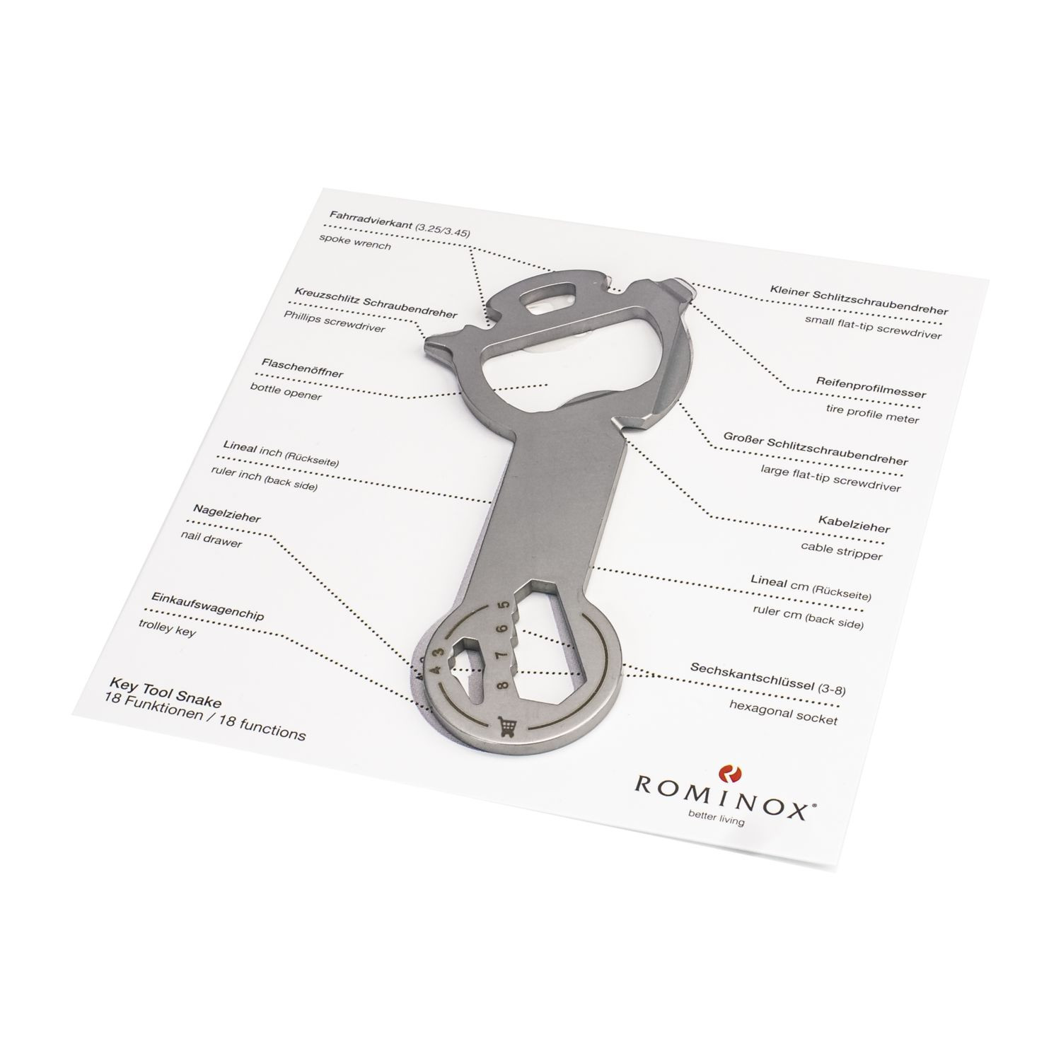 Überraschen Sie Ihre Handwerker mit Multifunktionstools als Schlüsselanhänger: ein ideales Geschenk nicht nur zum Geburtstag oder zu Weihnachten und nicht nur für Männer. Mit den kleinen Begleitern von ROMINOX® haben Sie die praktischsten Werkzeuge wie Schraubenzieher, Lineal oder Sechskantschlüssel immer dabei, egal ob im Alltag, im Büro oder auf Reisen. Das Key Tool Snake mit 18 Funktionen inkl. Einkaufswagenlöser kommt in einem „Viel Glück”-Mäppchen inkl. Funktionsbeschreibung. „An die Werkzeuge, fertig, los“! Finden Sie die perfekte Kombination aus Ihrem Lieblings Keytool und Motiv-Mäppchen. Auf Wunsch auch mit Gravur und/oder im Mäppchen im Eigendesign erhältlich.
